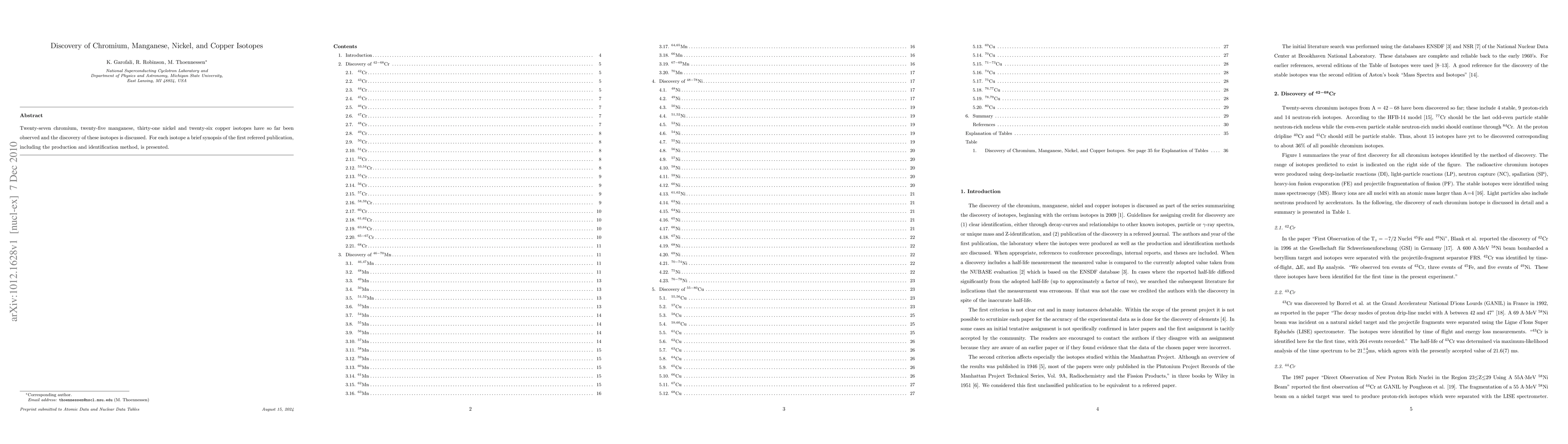 This paper discusses the discovery of 27 chromium, 25 manganese, 31 nickel, and 26 copper isotopes, detailing the production and identification methods from the first refereed publications for each isotope.