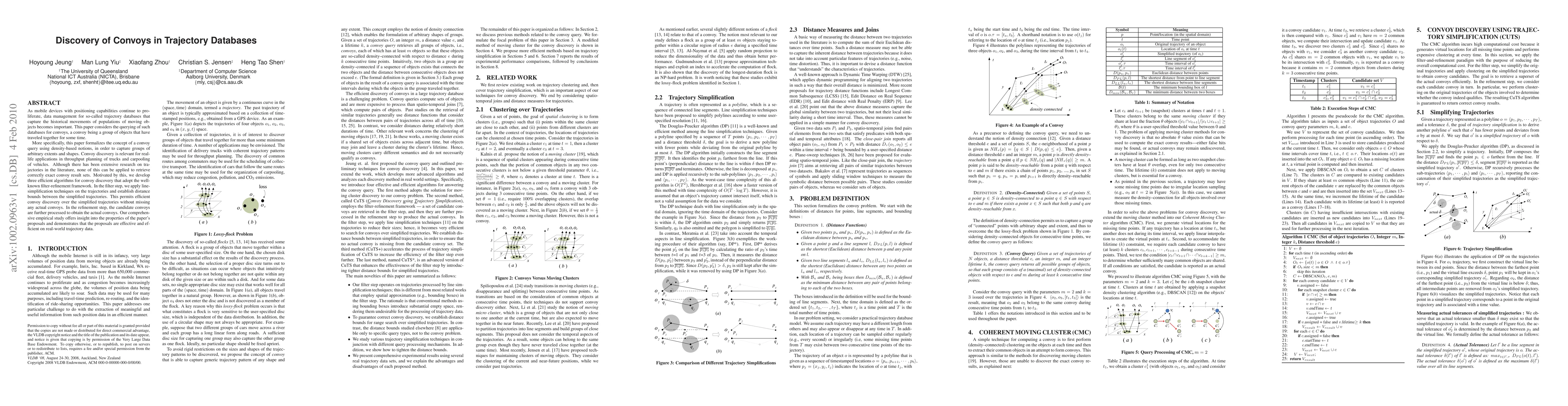 This paper introduces algorithms for discovering convoys—groups of objects traveling together—in trajectory databases using density-based notions. The proposed filter-refinement framework efficiently identifies convoys through trajectory simplification and refinement, validated by effective performance on real-world data.