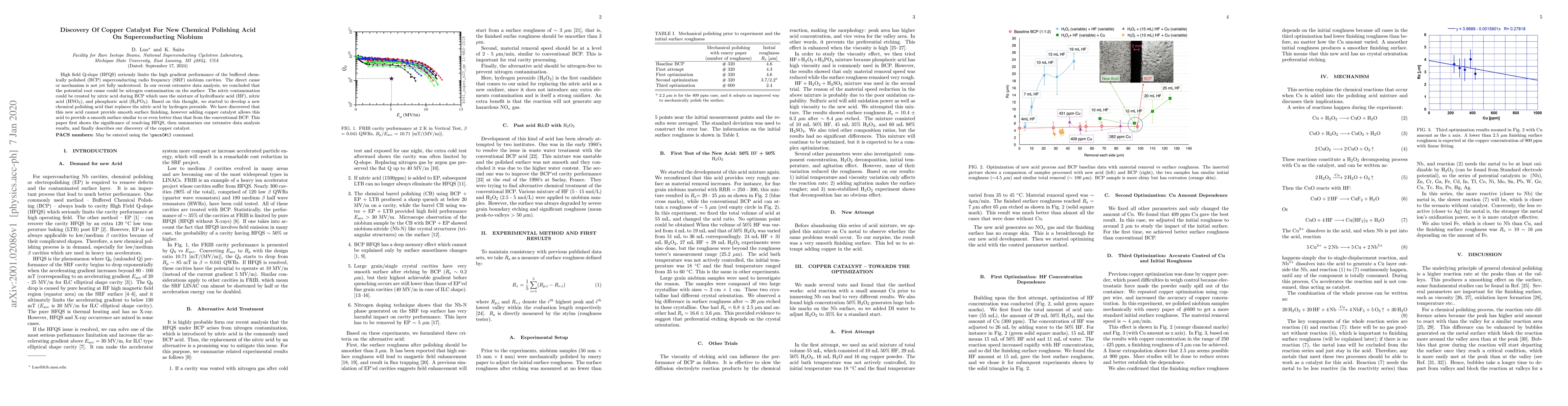 This paper explores the high field Q-slope limitation in superconducting niobium cavities, attributing it to nitrogen contamination from nitric acid in conventional polishing. The researchers discovered that a copper catalyst enhances a new polishing acid using hydrogen peroxide, resulting in a smoother surface finish comparable to conventional methods.