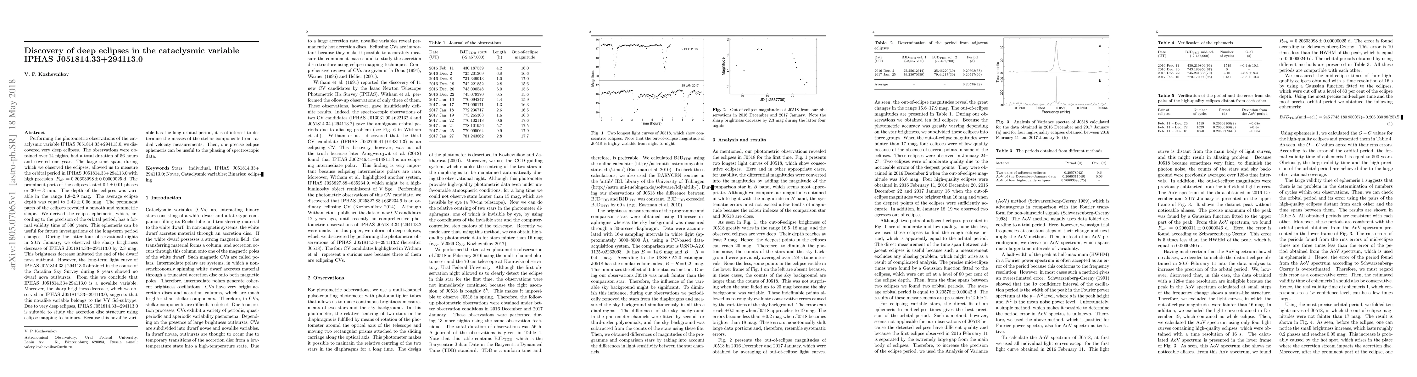 Researchers discovered deep eclipses in the cataclysmic variable IPHAS J051814.33+294113.0, measuring an orbital period of Porb=0.20603098±0.00000025 d. The eclipses' depth varied from 1.8 to 2.9 mag, with an average depth of 2.42±0.06 mag.