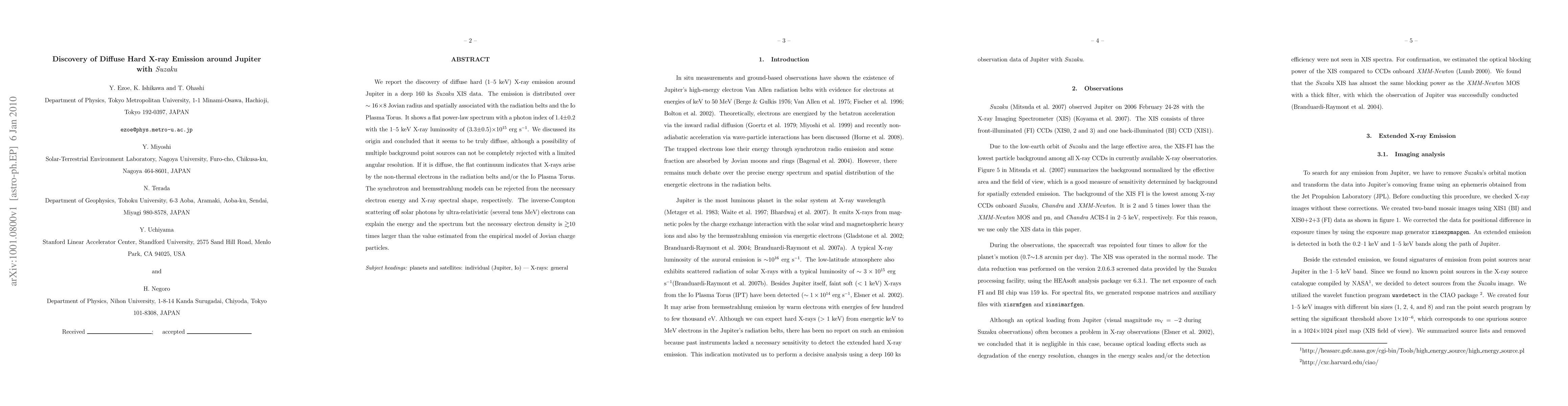 The paper reports the discovery of diffuse hard X-ray emission around Jupiter, detected using Suzaku data, which is associated with the radiation belts and the Io Plasma Torus. The emission's flat spectrum suggests it arises from non-thermal electrons, likely via inverse-Compton scattering, though the required electron density is significantly higher than current estimates.