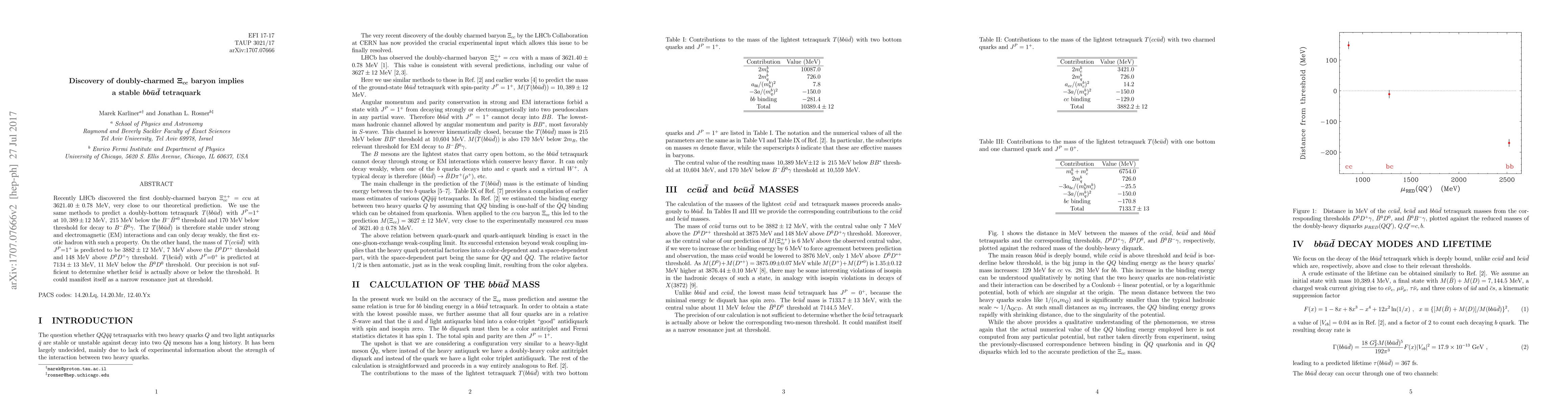 Recently LHCb discovered the first doubly-charmed baryon $\Xi_{cc}^{++} = ccu$ at $3621.40 \pm 0.78$ MeV, very close to our theoretical prediction. We use the same methods to predict a doubly-bottom tetraquark $T(bb\bar u\bar d)$ with $J^P{=}1^+$ at $10,389\pm 12$ MeV, 215 MeV below the $B^-\bar B^{*0}$ threshold and 170 MeV below threshold for decay to $B^-\bar B^0 \gamma$. The $T(bb\bar u\bar d)$ is therefore stable under strong and electromagnetic (EM) interactions and can only decay weakly, the first exotic hadron with such a property. On the other hand, the mass of $T(cc\bar u\bar d)$ with $J^P{=}1^+$ is predicted to be $3882\pm12$ MeV, 7 MeV above the $D^0 D^{*+}$ threshold and 148 MeV above $D^0 D^+ \gamma$ threshold. $T(bc\bar u\bar d)$ with $J^P{=}0^+$ is predicted at $7134\pm13$ MeV, 11 MeV below the $\bar B^0 D^0$ threshold. Our precision is not sufficient to determine whether $bc\bar u\bar d\,$ is actually above or below the threshold. It could manifest itself as a narrow resonance just at threshold.