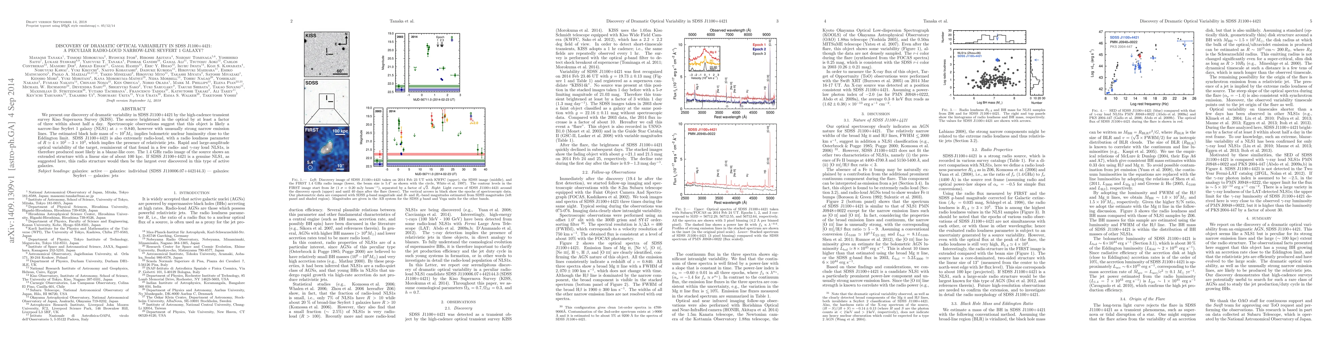 Researchers discovered extreme optical brightness variation in SDSS J1100+4421 within half a day, suggesting it's a rare, radio-loud narrow-line Seyfert 1 galaxy (NLS1) with unusually strong emission lines and black hole mass near Eddington limit. The source, at z=0.840, shows large-scale radio structure, potentially the largest ever found in NLS1s.