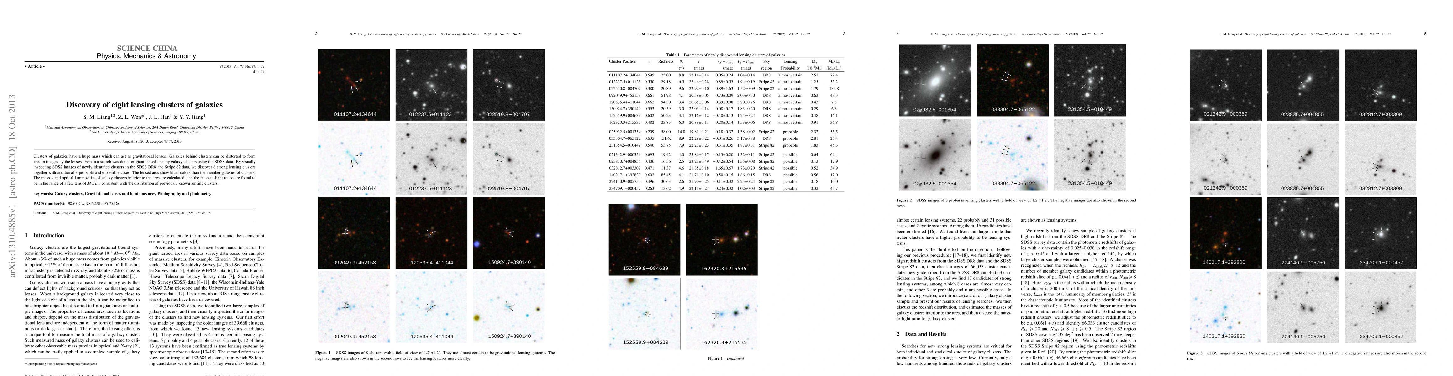 This paper discovers 8 giant lensing clusters of galaxies that distort images behind them, finding arcs with bluer colors than cluster member galaxies. The discovered lenses have masses consistent with previously known lensing clusters.