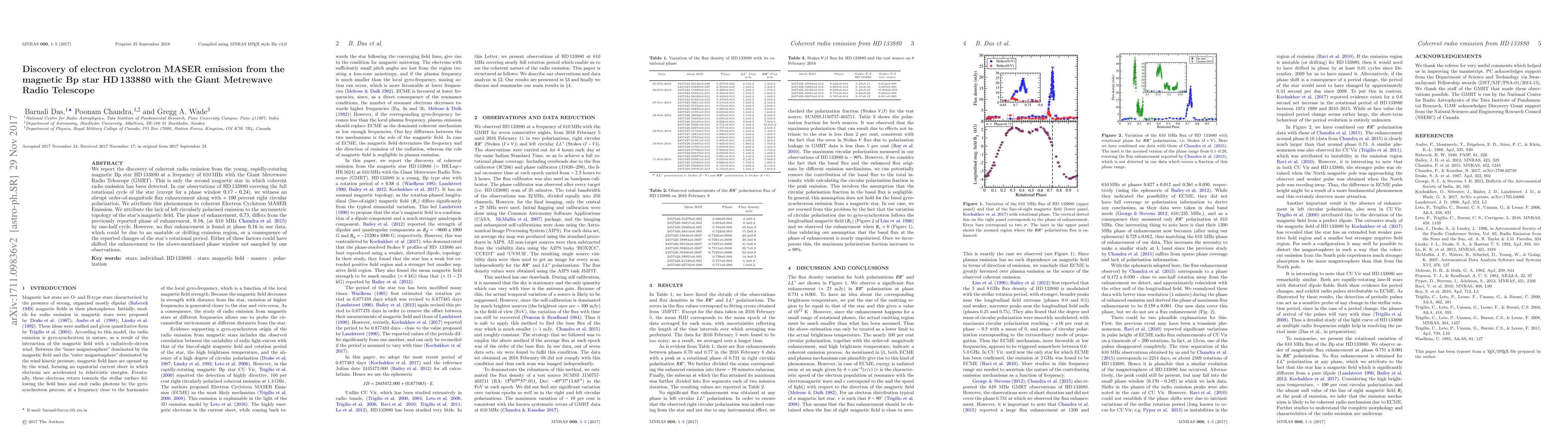 We report the discovery of coherent radio emission from the young, rapidly-rotating magnetic Bp star HD 133880 at a frequency of 610 MHz with the Giant Metrewave Radio Telescope (GMRT). This is only the second magnetic star in which coherent radio emission has been detected. In our observations of HD 133880 covering the full rotational cycle of the star (except for a phase window 0.17-0.24), we witness an abrupt order-of-magnitude flux enhancement along with $\approx100$ percent right circular polarization. We attribute this phenomenon to coherent Electron Cyclotron MASER Emission. We attribute the lack of left circularly polarised emission to the asymmetric topology of the star's magnetic field. The phase of enhancement, $0.73$, differs from the previously reported phase of enhancement, $0.16$, (at 610 MHz Chandra et al. 2015) by one-half cycle. However, no flux enhancement is found at phase $0.16$ in our data, which could be due to an unstable or drifting emission region, or a consequence of the reported changes of the star's rotational period. Either of these factors could have shifted the enhancement to the above-mentioned phase window not sampled by our observations.