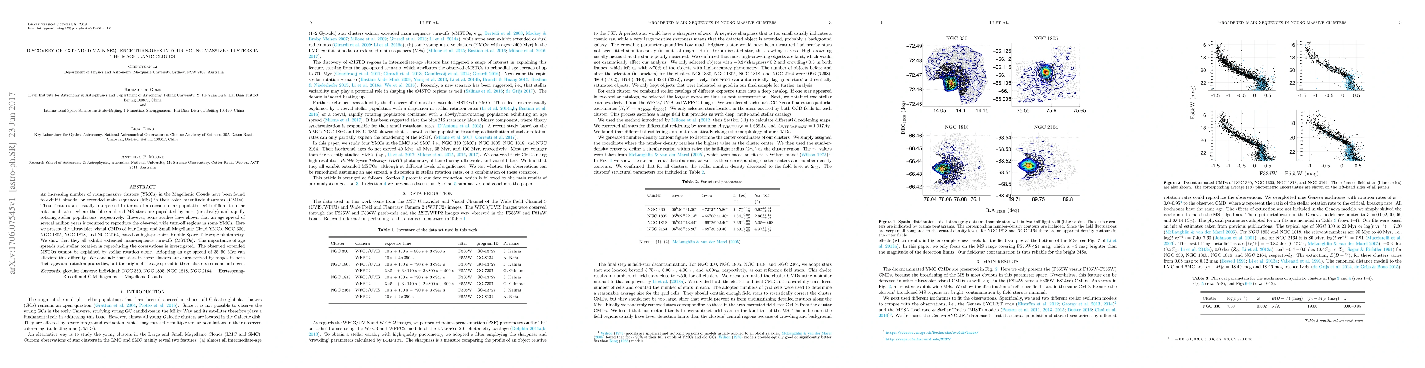 This paper investigates the extended main-sequence turn-offs in four young massive clusters in the Magellanic Clouds, revealing that ultraviolet-visual color-magnitude diagrams show these features. The study finds that stellar rotation alone cannot explain the observed extended turn-offs, suggesting an age spread of 35-50 Myr is necessary, though the origin of this age spread remains unclear.