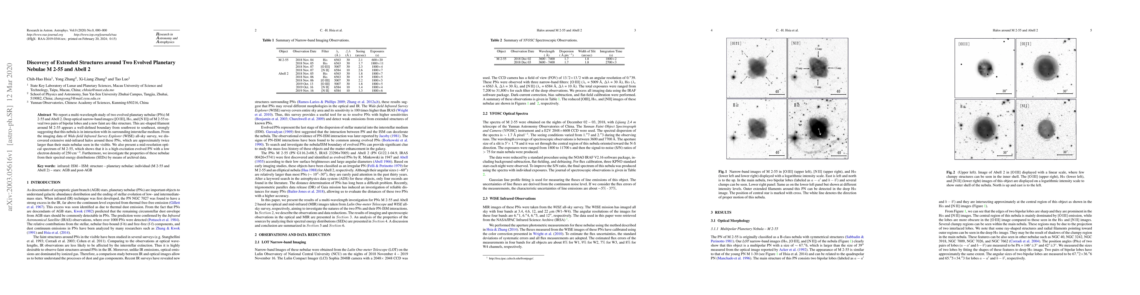 This study reveals extended structures around the evolved planetary nebulae M 2-55 and Abell 2, including bipolar lobes and a new arc-like filament in M 2-55, and extensive mid-infrared halos twice the size of the visible nebulae, suggesting interaction with the interstellar medium.