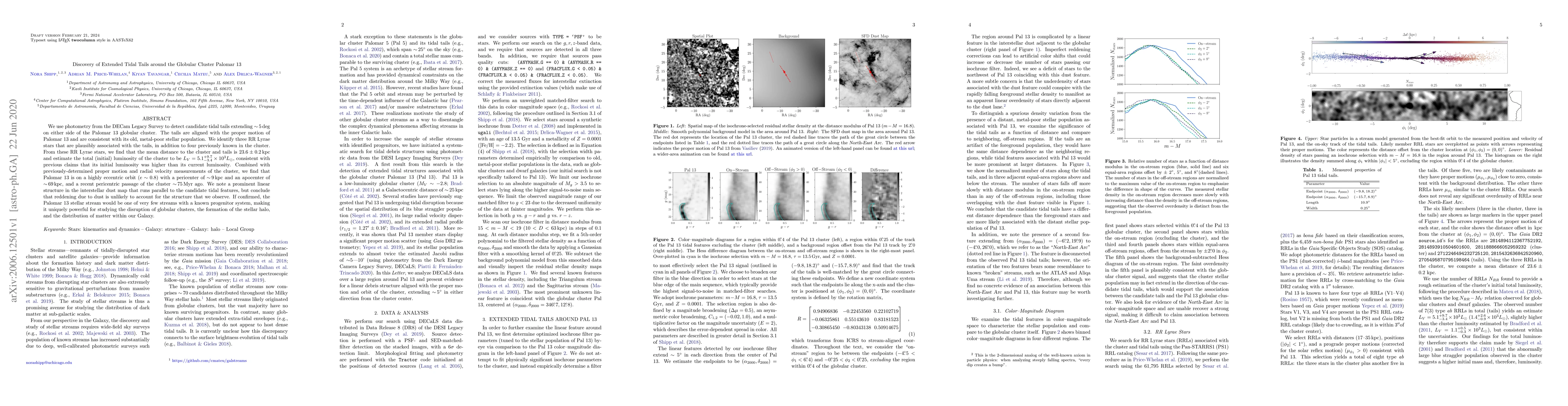 Researchers discovered extended tidal tails around the globular cluster Palomar 13 using DECam Legacy Survey data, finding them aligned with the cluster's proper motion and consistent with its old, metal-poor stellar population. The study estimates the cluster's mean distance at 23.6 kpc and suggests a highly eccentric orbit, providing valuable insights into globular cluster disruption and the Galaxy's stellar halo formation.
