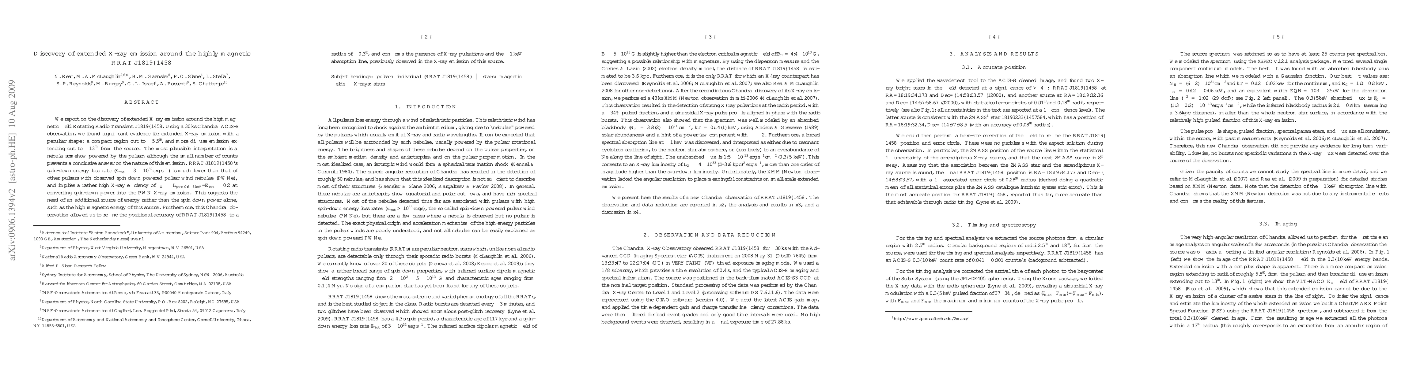 The paper reports the discovery of extended X-ray emission around the highly magnetic Rotating Radio Transient J1819-1458, revealing a compact region and diffuse emission extending up to 13". The findings suggest an additional energy source beyond spin-down power is needed to power the nebula, likely due to the pulsar's high magnetic field.