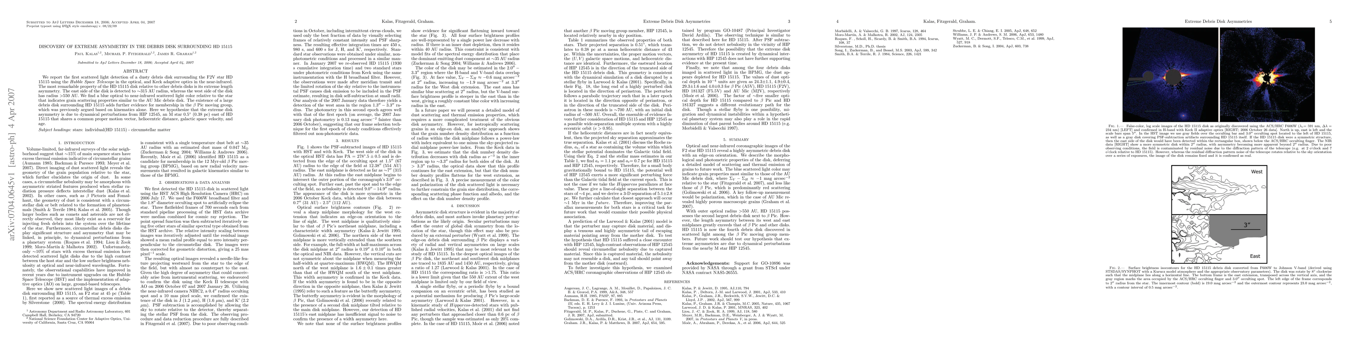 This paper reports the discovery of an extremely asymmetric debris disk around the star HD 15115, detected using the Hubble Space Telescope and Keck adaptive optics. The disk's east side extends to 315 AU, while the west side extends beyond 550 AU, suggesting a dynamical perturbation likely caused by the nearby M star HIP 12545.