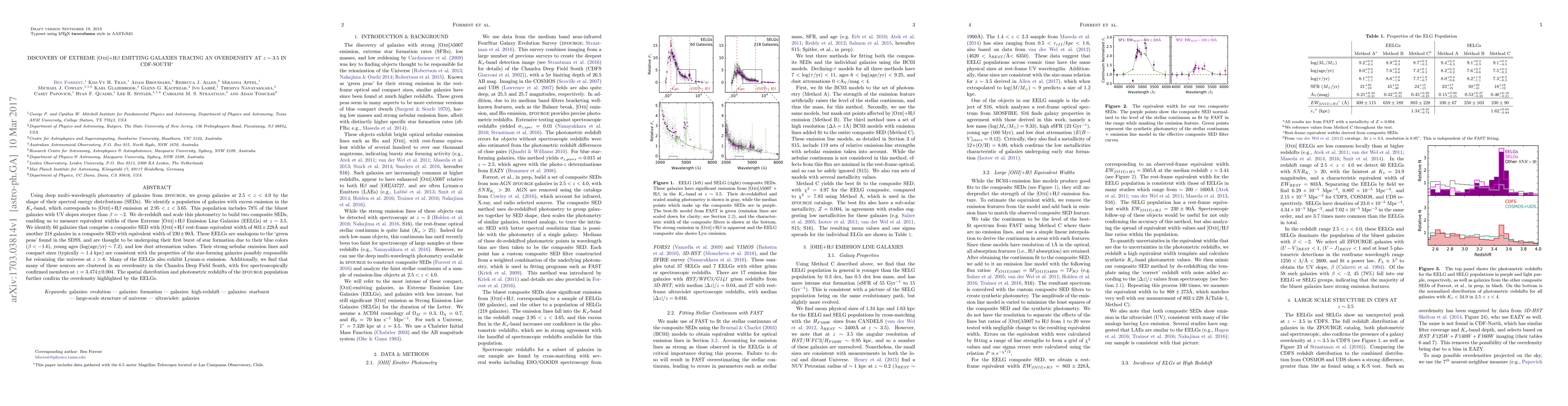 This paper identifies a population of Extreme [OIII]+H$\beta$ Emitting Galaxies (EELGs) at $z\sim3.5$ in the CDF-South, characterized by strong nebular emission lines and blue colors, suggesting they are undergoing their first burst of star formation. These galaxies form an overdensity, indicating a possible clustering of star-forming galaxies that may have contributed to reionization at high redshifts.