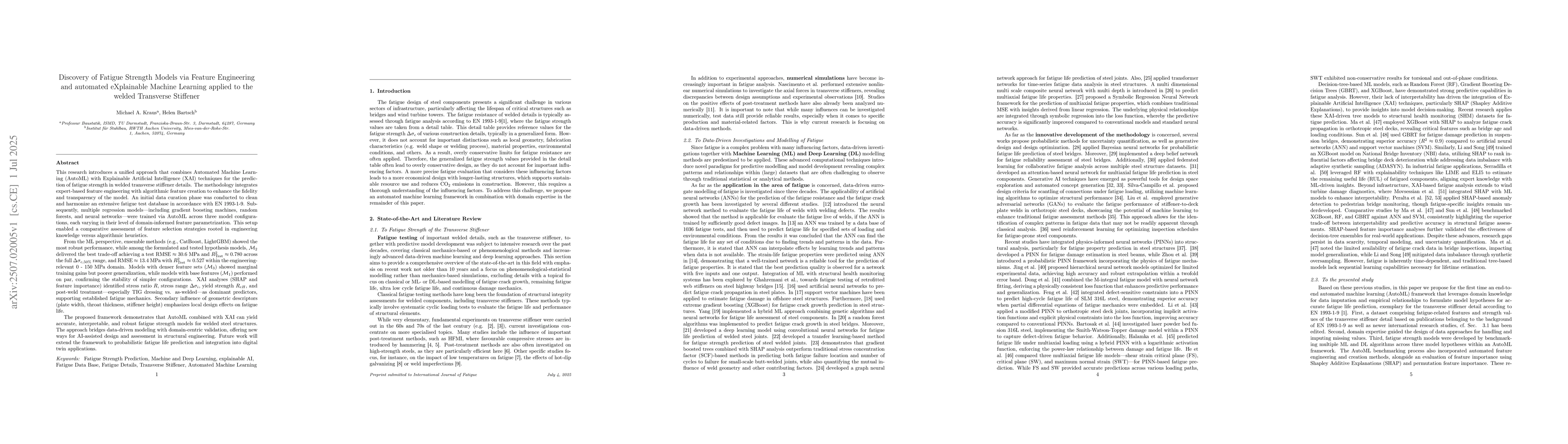 This research introduces a unified approach combining Automated Machine Learning (AutoML) with Explainable Artificial Intelligence (XAI) to predict fatigue strength in welded transverse stiffener details. It integrates expert-driven feature engineering with algorithmic feature creation to enhance accuracy and explainability. Based on the extensive fatigue test database regression models - gradient boosting, random forests, and neural networks - were trained using AutoML under three feature schemes: domain-informed, algorithmic, and combined. This allowed a systematic comparison of expert-based versus automated feature selection. Ensemble methods (e.g. CatBoost, LightGBM) delivered top performance. The domain-informed model $\mathcal M_2$ achieved the best balance: test RMSE $\approx$ 30.6 MPa and $R^2 \approx 0.780% over the full $\Delta \sigma_{c,50\%}$ range, and RMSE $\approx$ 13.4 MPa and $R^2 \approx 0.527% within the engineering-relevant 0 - 150 MPa domain. The denser-feature model ($\mathcal M_3$) showed minor gains during training but poorer generalization, while the simpler base-feature model ($\mathcal M_1$) performed comparably, confirming the robustness of minimalist designs. XAI methods (SHAP and feature importance) identified stress ratio $R$, stress range $\Delta \sigma_i$, yield strength $R_{eH}$, and post-weld treatment (TIG dressing vs. as-welded) as dominant predictors. Secondary geometric factors - plate width, throat thickness, stiffener height - also significantly affected fatigue life. This framework demonstrates that integrating AutoML with XAI yields accurate, interpretable, and robust fatigue strength models for welded steel structures. It bridges data-driven modeling with engineering validation, enabling AI-assisted design and assessment. Future work will explore probabilistic fatigue life modeling and integration into digital twin environments.