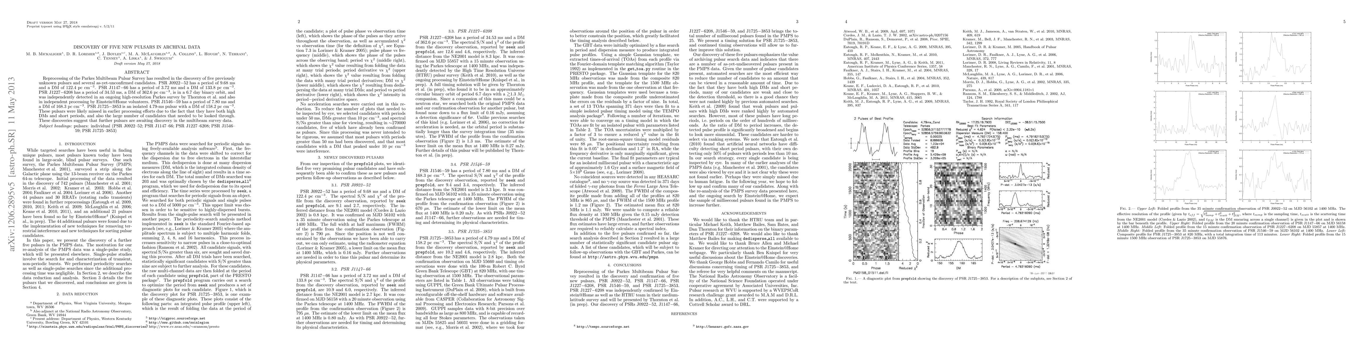 The reprocessing of archival data from the Parkes Multibeam Pulsar Survey has led to the discovery of five new pulsars, including PSR J0922-52, PSR J1147-66, PSR J1227-6208, PSR J1546-59, and PSR J1725-3853, indicating that more pulsars may remain undetected in the survey data. These newly identified pulsars have short periods and high dispersion measures, which likely contributed to their earlier oversight amidst numerous candidates.