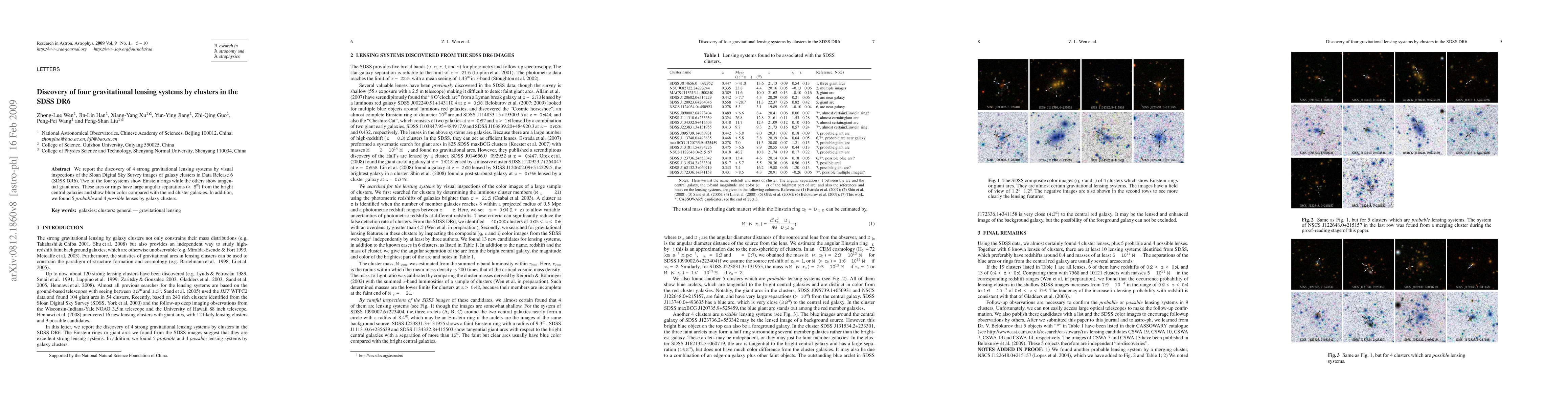The study reports the discovery of four strong gravitational lensing systems in SDSS DR6, featuring Einstein rings and tangential giant arcs. These lensing systems exhibit significant angular separations and bluer colors compared to the central cluster galaxies.