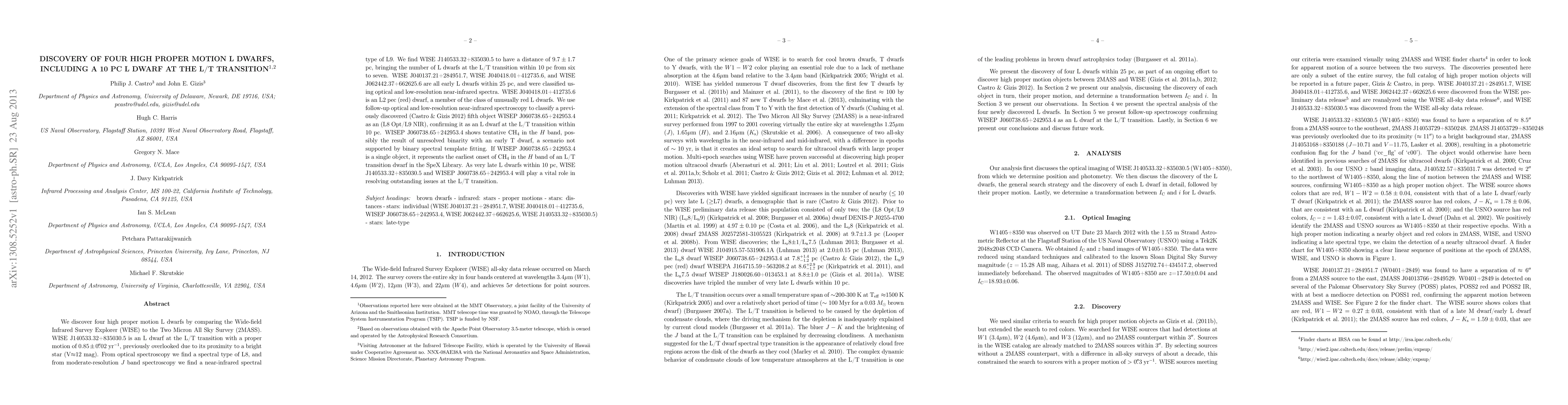 The paper reports the discovery of four high proper motion L dwarfs, including an L dwarf at the L/T transition with a proper motion of 0.85" yr^-1, previously overlooked due to its proximity to a bright star. The study classifies these objects using optical and near-infrared spectra, highlighting the importance of these very late L dwarfs within 10 pc for resolving issues at the L/T transition.