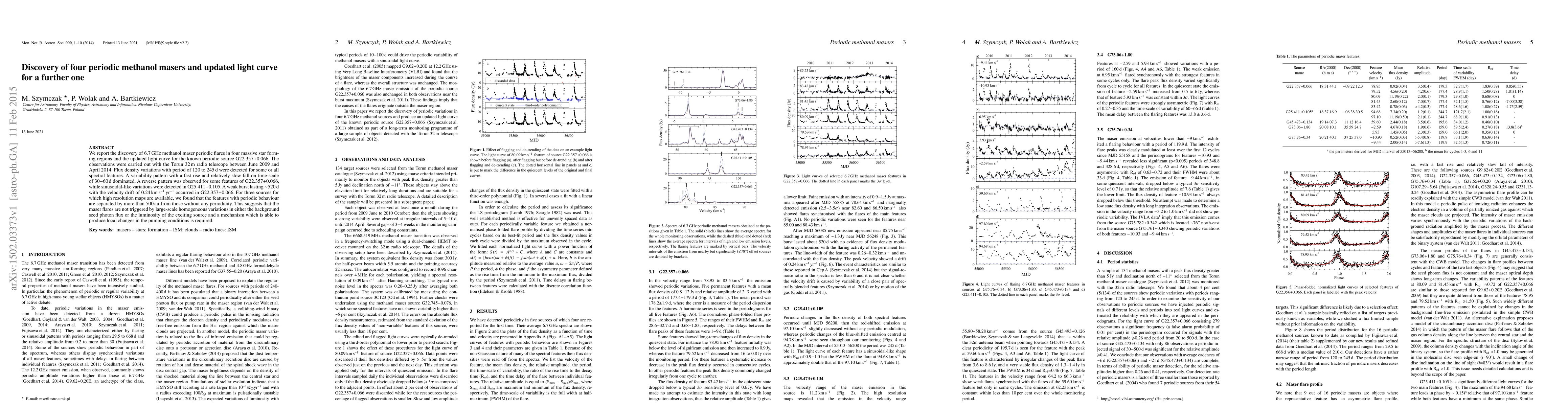 We report the discovery of 6.7 GHz methanol maser periodic flares in four massive star forming regions and the updated light curve for the known periodic source G22.357+0.066. The observations were carried out with the Torun 32 m radio telescope between June 2009 and April 2014. Flux density variations with period of 120 to 245 d were detected for some or all spectral features. A variability pattern with a fast rise and relatively slow fall on time-scale of 30-60 d dominated. A reverse pattern was observed for some features of G22.357+0.066, while sinusoidal-like variations were detected in G25.411+0.105. A weak burst lasting ~520 d with the velocity drift of 0.24 km/s/yr occurred in G22.357+0.066. For three sources for which high resolution maps are available, we found that the features with periodic behaviour are separated by more than 500 au from those without any periodicity. This suggests that the maser flares are not triggered by large-scale homogeneous variations in either the background seed photon flux or the luminosity of the exciting source and a mechanism which is able to produce local changes in the pumping conditions is required.