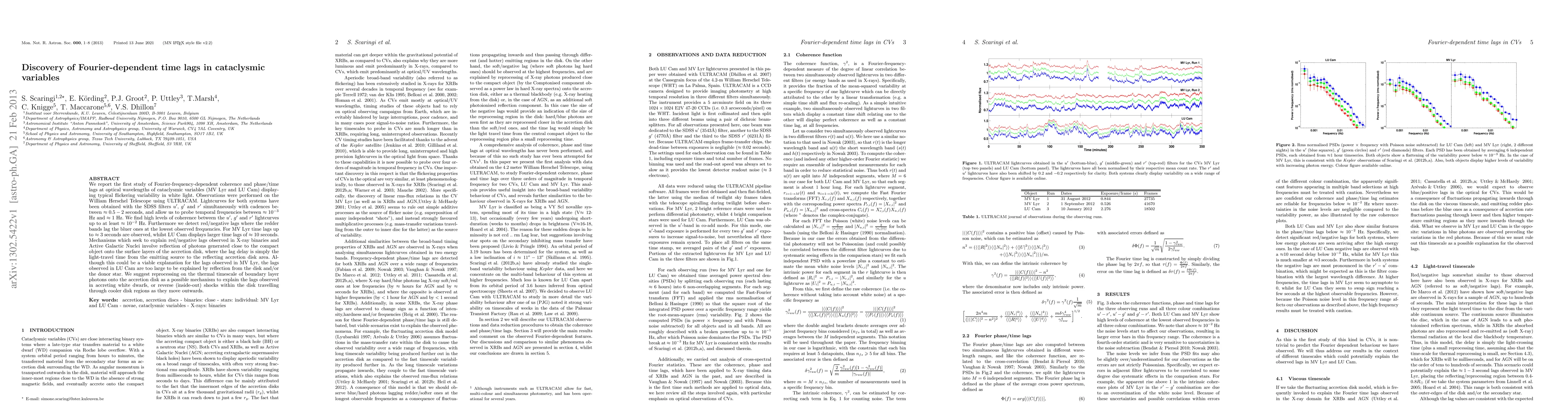 We report the first study of Fourier-frequency-dependent coherence and phase/time lags at optical wavelengths of cataclysmic variables (MV Lyr and LU Cam) displaying typical flickering variability in white light. Observations were performed on the William Herschel Telescope using ULTRACAM. Lightcurves for both systems have been obtained with the SDSS filters $u'$, $g'$ and $r'$ simultaneously with cadences between $\approx0.5-2$ seconds, and allow us to probe temporal frequencies between ~10^{-3} Hz and ~1 Hz. We find high levels of coherence between the u', g' and r' lightcurves up to at least ~10^{-2} Hz. Furthermore we detect red/negative lags where the redder bands lag the bluer ones at the lowest observed frequencies. For MV Lyr time lags up to ~3 seconds are observed, whilst LU Cam displays larger time lags of ~10 seconds. Mechanisms which seek to explain red/negative lags observed in X-ray binaries and Active Galactic Nuclei involve reflection of photons generated close to the compact object onto the surface layers of the accretion disk, where the lag delay is simply the light-travel time from the emitting source to the reflecting accretion disk area. Although this could be a viable explanation for the lags observed in MV Lyr, the lags observed in LU Cam are too large to be explained by reflection from the disk and/or the donor star. We suggest reprocessing on the thermal timescale of boundary layer photons onto the accretion disk as a possible mechanism to explain the lags observed in accreting white dwarfs, or reverse (inside-out) shocks within the disk travelling through cooler disk regions as they move outwards.