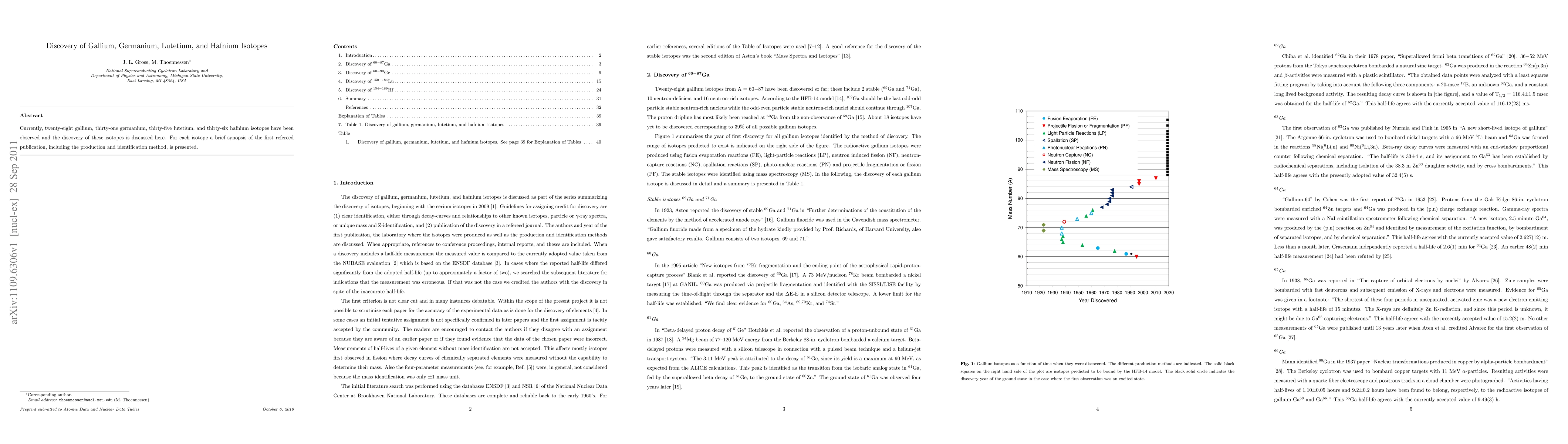 This paper reports the discovery and initial characterization of twenty-eight gallium, thirty-one germanium, thirty-five lutetium, and thirty-six hafnium isotopes, detailing the production and identification methods used in the first refereed publications for each isotope.