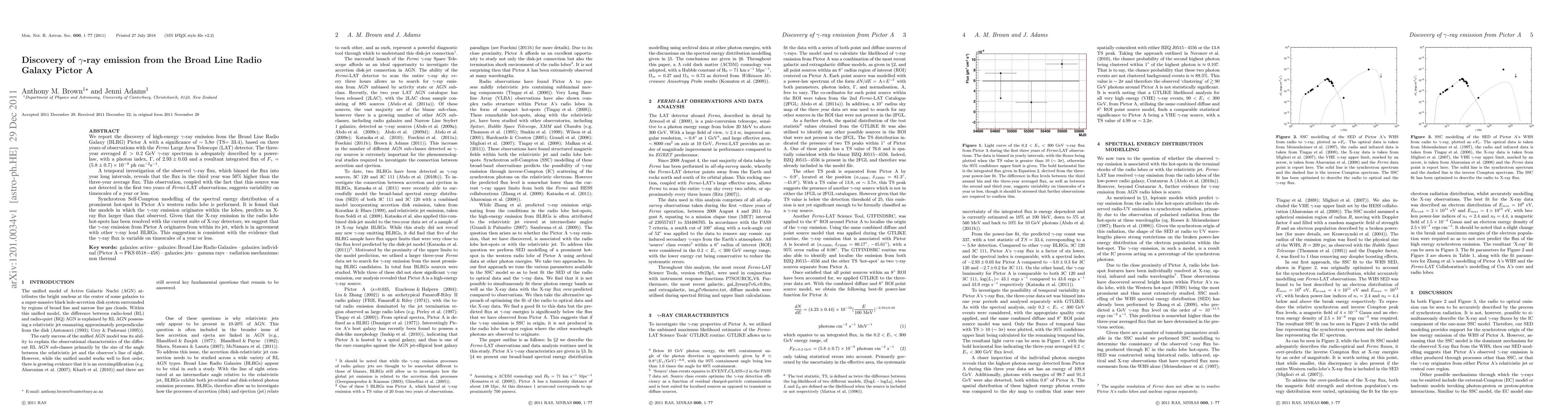 The Fermi Large Area Telescope detected significant gamma-ray emission from the Broad Line Radio Galaxy Pictor A, indicating a power-law spectrum with a photon index of 2.93. The observed gamma-ray flux showed variability, being 50% higher in the third year, suggesting emission originates from the jet rather than the radio lobes.