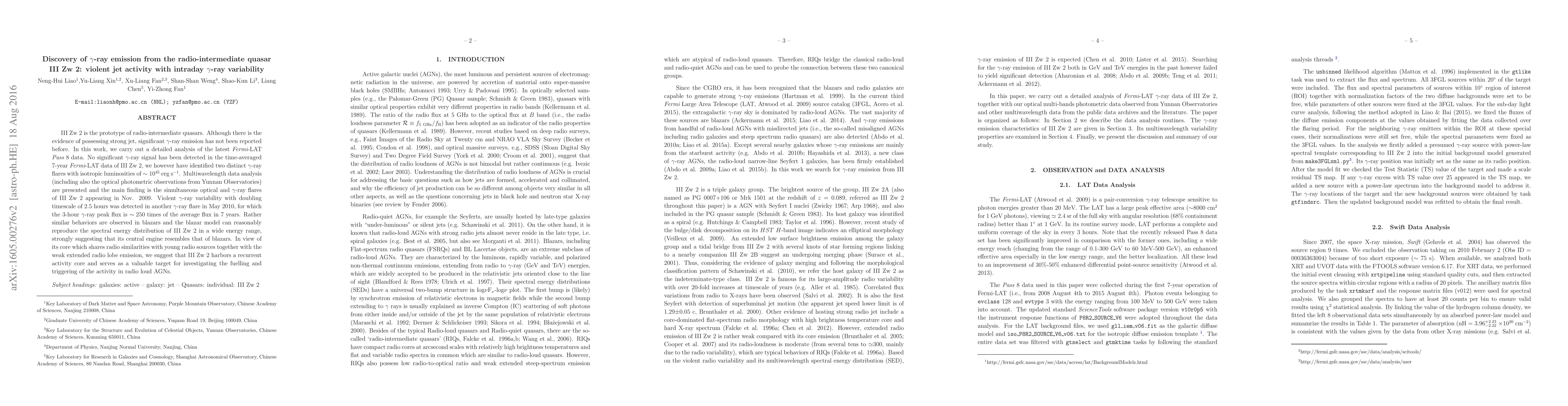 This paper reports the discovery of $\gamma$-ray emission from the radio-intermediate quasar III Zw 2, revealing violent jet activity with intraday $\gamma$-ray variability. The study identifies two $\gamma$-ray flares, including one with a doubling timescale of 2.5 hours, suggesting a central engine similar to blazars and indicating recurrent activity in the quasar's core.