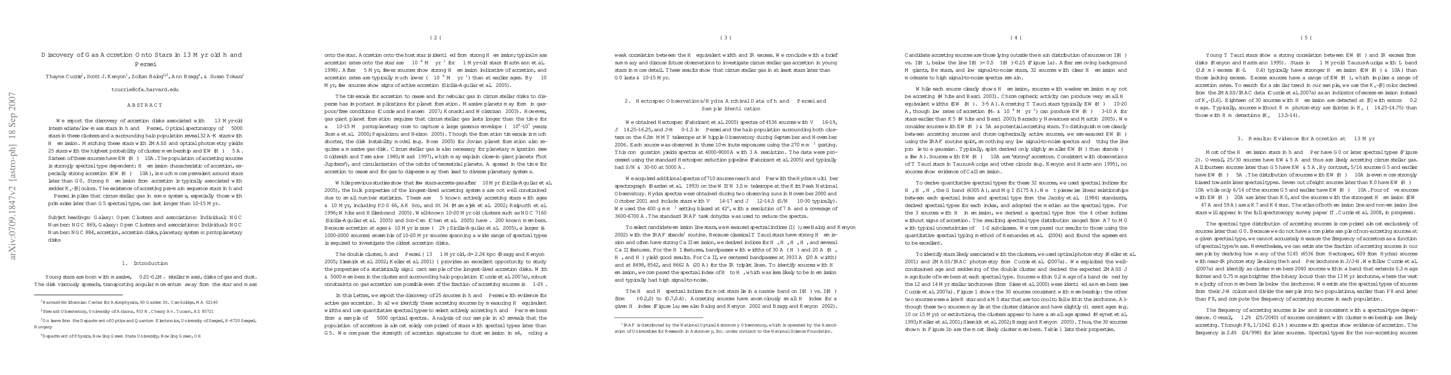 We report the discovery of accretion disks associated with ~ 13 Myr-old intermediate/low-mass stars in h and chi Persei. Optical spectroscopy of ~ 5000 stars in these clusters and a surrounding halo population reveal 32 A-K stars with H(alpha) emission. Matching these stars with 2MASS and optical photometry yields 25 stars with the highest probability of cluster membership and EW(H(alpha)) > 5 angstroms. Sixteen of these sources have EW(H(alpha)) > 10 angstroms. The population of accreting sources is strongly spectral type dependent: H(alpha) emission characteristic of accretion, especially strong accretion (EW(H(alpha)) > 10 angstroms), is much more prevalent around stars later than G0. Strong H(alpha) emission from accretion is typically associated with redder Ks-[8] colors. The existence of accreting pre-main sequence stars in h and chi Persei implies that circumstellar gas in some systems, especially those with primaries later than G5 spectral type, can last longer than 10-15 Myr.