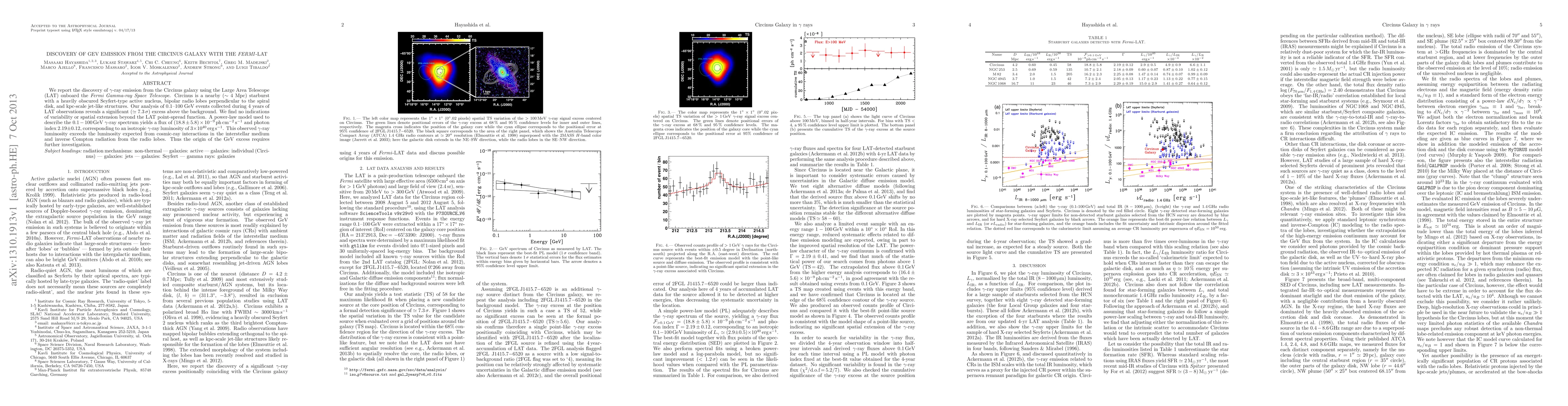 We report the discovery of gamma-ray emission from the Circinus galaxy using the Large Area Telescope (LAT) onboard the Fermi Gamma-ray Space Telescope. Circinus is a nearby (~4 Mpc) starburst with a heavily obscured Seyfert-type active nucleus, bipolar radio lobes perpendicular to the spiral disk, and kpc-scale jet-like structures. Our analysis of 0.1-100 GeV events collected during 4 years of LAT observations reveals a significant (~ 7.3 sigma) excess above the background. We find no indications of variability or spatial extension beyond the LAT point-spread function. A power-law model used to describe the 0.1-100 GeV gamma-ray spectrum yields a flux of (18.8+/-5.8)x10^{-9} ph cm^{-2} s^{-1} and photon index 2.19+/-0.12, corresponding to an isotropic gamma-ray luminosity of 3 x 10^{40} erg s^{-1}. This observed gamma-ray luminosity exceeds the luminosity expected from cosmic-ray interactions in the interstellar medium and inverse Compton radiation from the radio lobes. Thus the origin of the GeV excess requires further investigation.