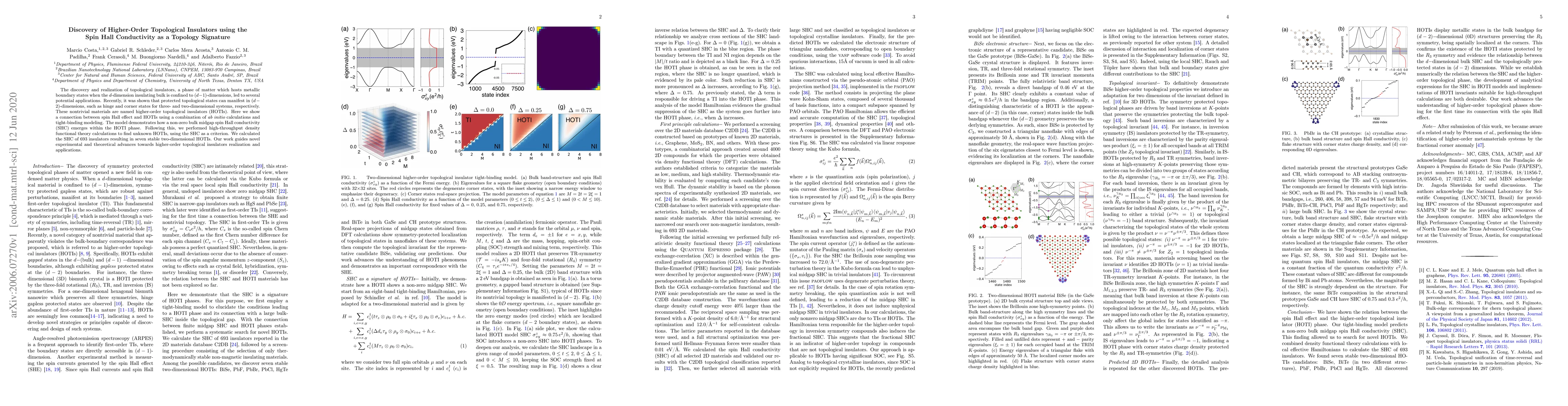 This paper discovers higher-order topological insulators (HOTIs) using spin Hall conductivity as a signature, demonstrating a non-zero bulk midgap spin Hall conductivity in these materials. The study identifies seven stable two-dimensional HOTIs through high-throughput density functional theory calculations, paving the way for future experimental and theoretical explorations.