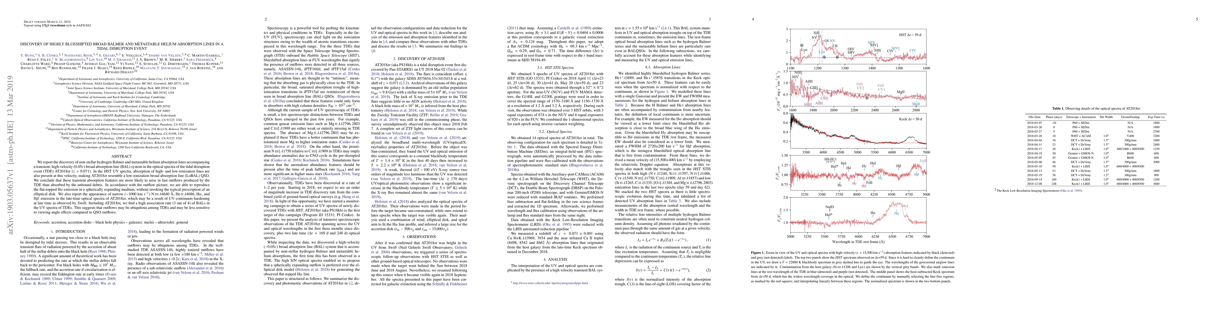 The paper reports the discovery of unusual, fast-moving (0.05c) broad absorption lines in the optical spectra of the tidal disruption event (TDE) AT2018zr, along with high-velocity metastable helium absorption. These features are similar to Low-Ionization Broad Absorption Line (LoBAL) Quasars. The authors propose that these are outflows from the TDE, not absorbed debris, and successfully model the flat-topped Hα emission in a spherically expanding medium. Late-time optical spectra reveal narrow emission lines, possibly due to UV continuum hardening. The study finds a high incidence (3 out of 4) of such broad outflows in TDEs, suggesting they may be common and less dependent on viewing angle than Quasar outflows.