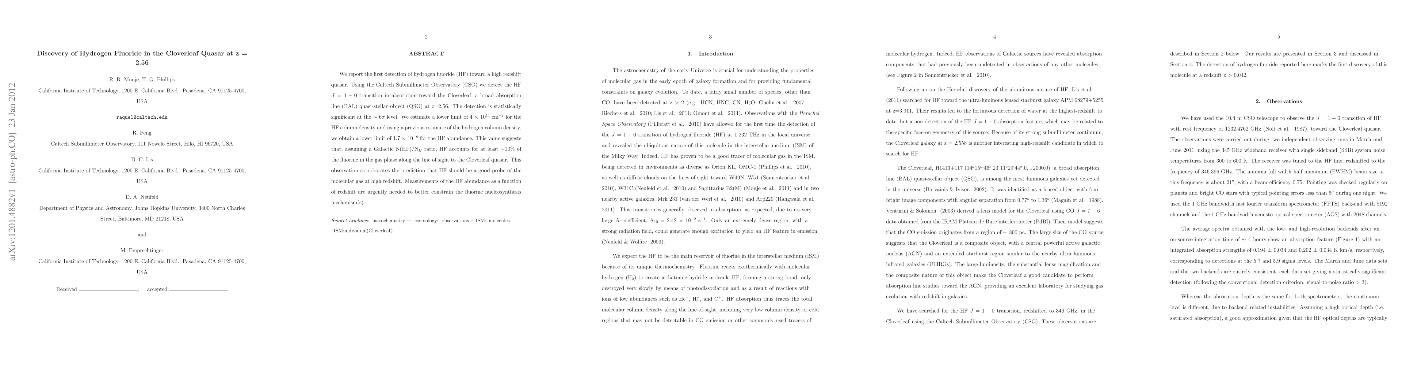 The first detection of hydrogen fluoride (HF) in absorption toward the Cloverleaf quasar at z=2.56 is reported, suggesting HF accounts for at least ~10% of fluorine in the gas phase, indicating its potential as a probe for molecular gas at high redshifts. Further measurements of HF abundance across redshifts are needed to understand fluorine nucleosynthesis.
