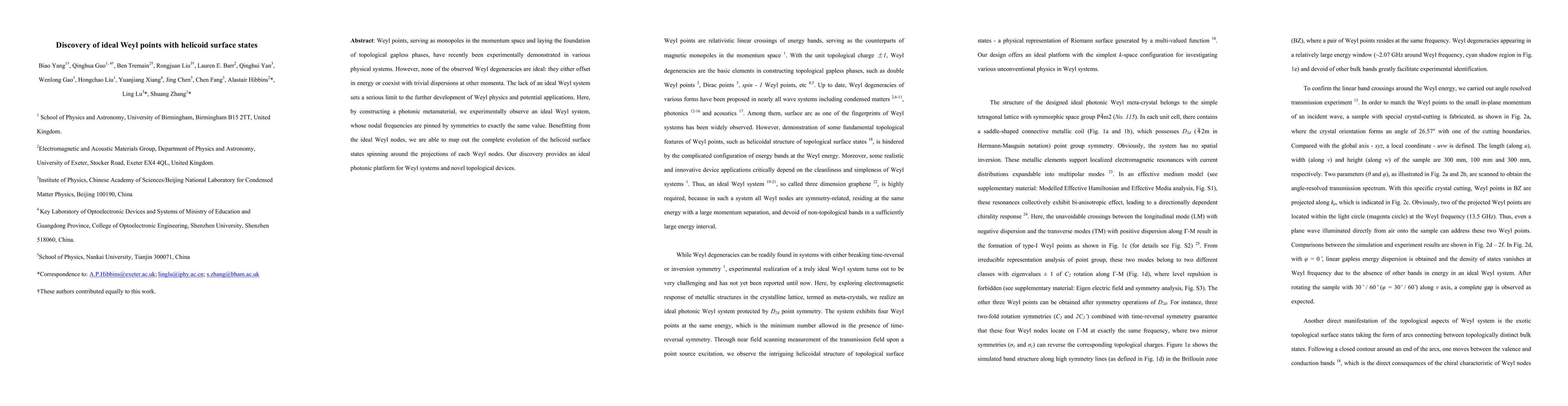 This paper reports the experimental discovery of an ideal Weyl point in a photonic metamaterial, where the Weyl degeneracies are perfectly aligned in energy. This breakthrough allows for the mapping of helicoid surface states, offering a superior platform for advancing Weyl physics and developing new topological devices.