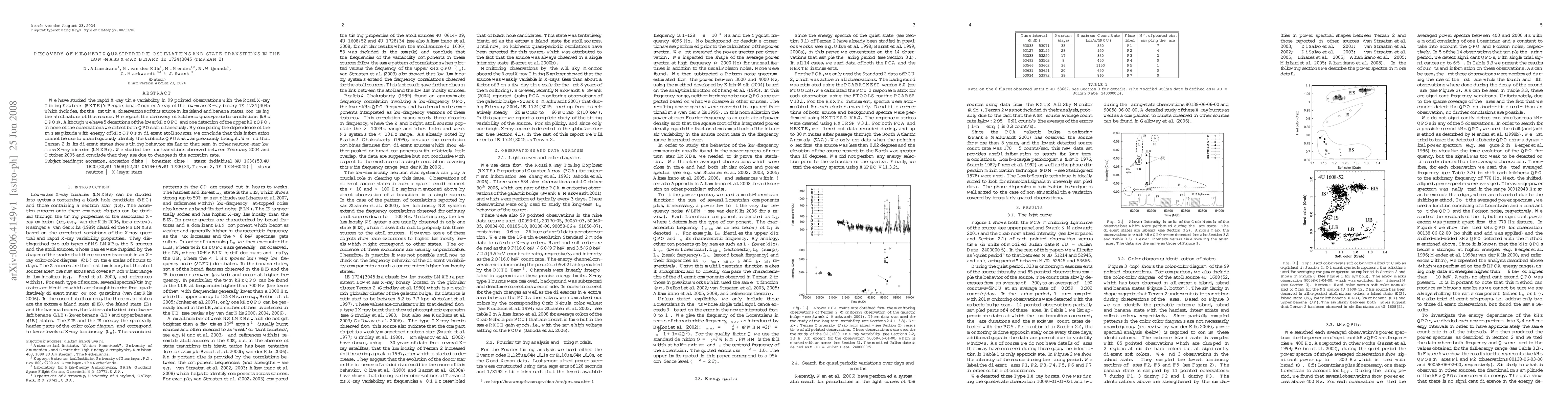 We have studied the rapid X-ray time variability in 99 pointed observations with the Rossi X-ray Timing Explorer (RXTE)'s Proportional Counter Array of the low-mass X-ray binary 1E~1724--3045 which includes, for the first time, observations of this source in its island and banana states, confirming the atoll nature of this source. We report the discovery of kilohertz quasi-periodic oscillations (kHz QPOs). Although we have 5 detections of the lower kHz QPO and one detection of the upper kHz QPO, in none of the observations we detect both QPOs simultaneously. By comparing the dependence of the rms amplitude with energy of kHz QPOs in different atoll sources, we conclude that this information cannot be use to unambiguously identify the kilohertz QPOs as was previously thought. We find that Terzan~2 in its different states shows timing behavior similar to that seen in other neutron-star low mass X-ray binaries (LMXBs). We studied the flux transitions observed between February 2004 and October 2005 and conclude that they are due to changes in the accretion rate.