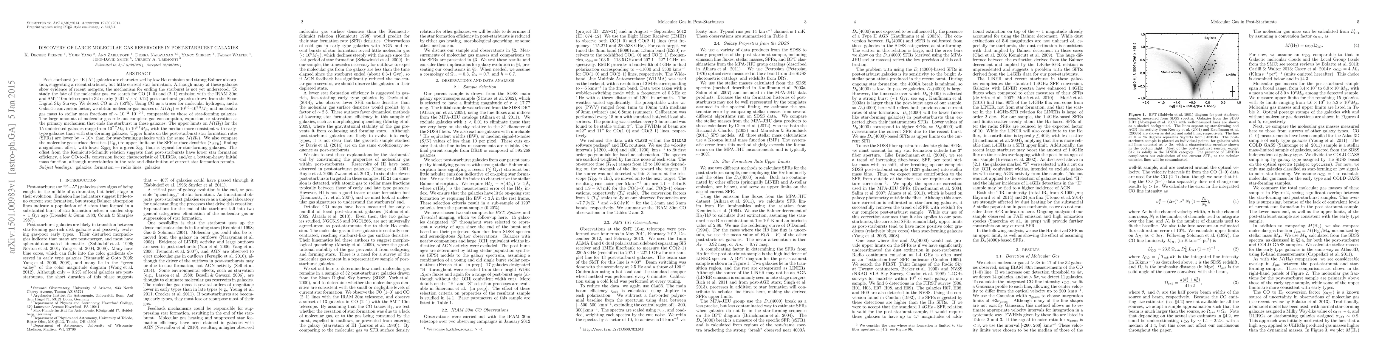 This study reveals significant molecular gas reservoirs in post-starburst galaxies, detected via CO emissions, with masses comparable to star-forming galaxies, suggesting that gas consumption or expulsion is not the primary mechanism ending the starburst. The detected galaxies show lower star formation efficiencies compared to typical star-forming galaxies, indicating possible differences in star formation processes or initial mass function.