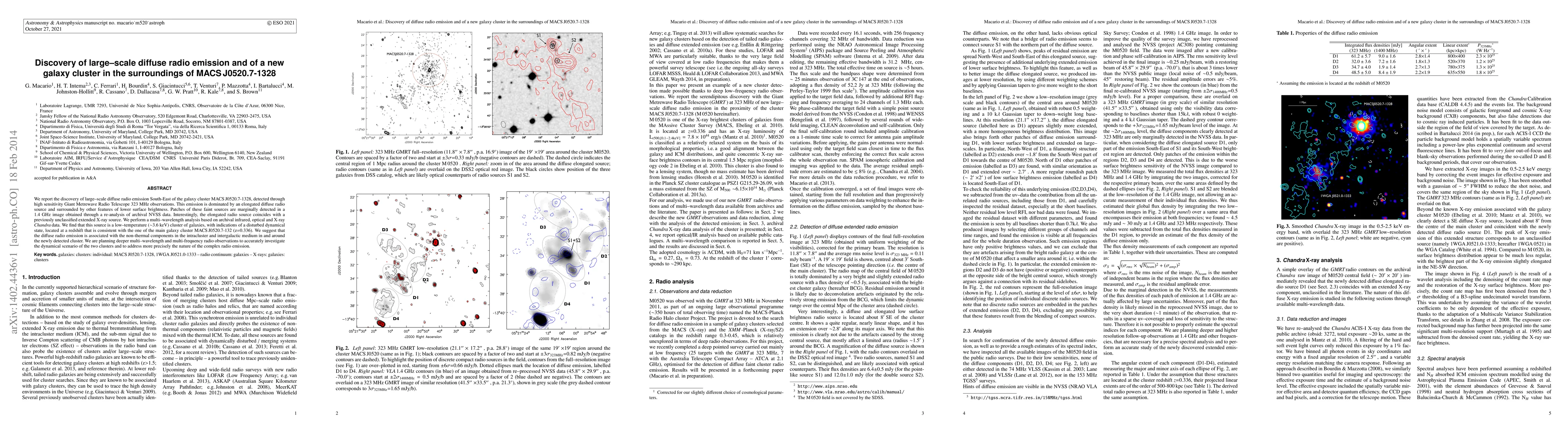 Researchers discovered large-scale diffuse radio emission south-east of the MACS J0520.7-1328 galaxy cluster using GMRT 323 MHz observations. This emission, an elongated radio source, is linked to a previously unclassified low-temperature (~3.6 keV) galaxy cluster at z=0.336, suggesting the radio emission originates from non-thermal components in its intracluster and intergalactic medium.
