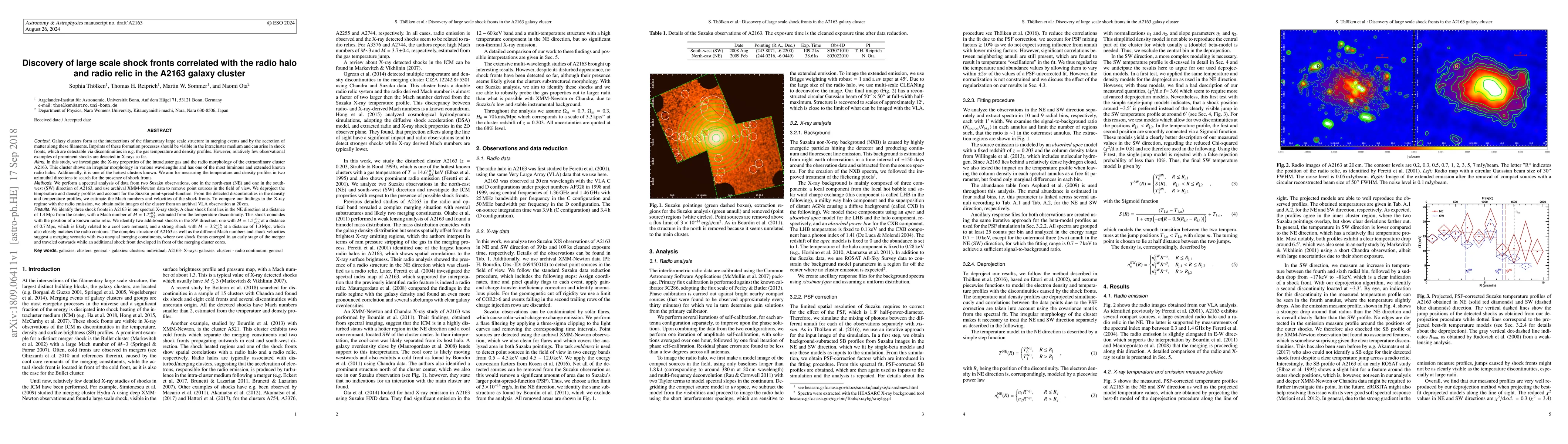 Imprints of galaxy cluster formation processes are visible in the intracluster medium and can arise in shock fronts, which are detectable via discontinuities in e.g. the gas temperature and density profiles. In this study, we investigate the X-ray properties of the intracluster gas and the radio morphology of the extraordinary cluster A2163. This cluster shows an irregular morphology in various wavelengths and has one of the most luminous and extended known radio halos. Additionally, it is one of the hottest clusters known. We analyze two Suzaku observations of A2163, one in the north-east (NE) and one in the south-west (SW) direction, and use archival XMM-Newton data to remove point sources in the field of view. To compare our findings in the X-ray regime with the radio emission, we obtain radio images of the cluster from an archival VLA observation at 20cm. We identify three shock fronts in A2163 in our spectral X-ray study. A clear shock front lies in the NE direction at a distance of 1.4Mpc from the center, with a Mach number of $M=1.7_{-0.2}^{+0.3}$, estimated from the temperature discontinuity. This shock coincides with the position of a known radio relic. We identify two additional shocks in the SW direction, one with $M=1.5_{-0.3}^{+0.5}$ at a distance of 0.7Mpc, which is likely related to a cool core remnant, and a strong shock with $M=3.2_{-0.7}^{+0.6}$ at a distance of 1.3Mpc, which also closely matches the radio contours. The complex structure of A2163 as well as the different Mach numbers and shock velocities suggest a merging scenario with two unequal merging constituents, where two shock fronts emerged in an early stage of the merger and traveled outwards while an additional shock front developed in front of the merging cluster cores.