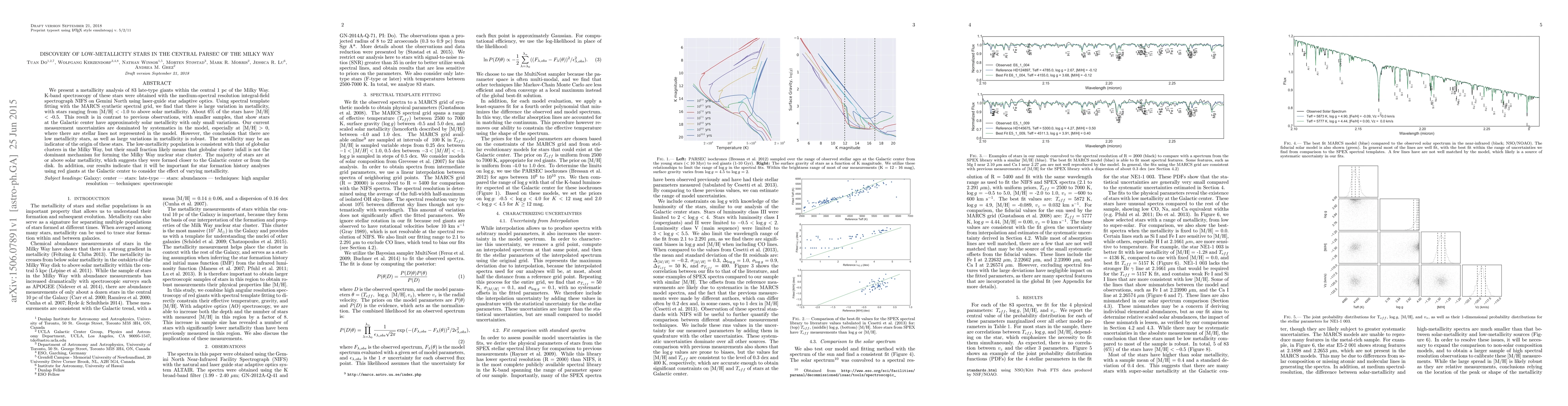 This study reveals significant metallicity variations among 83 late-type giants in the central parsec of the Milky Way, with some stars exhibiting metallicities below -0.5, contrasting previous findings of predominantly solar metallicity stars. The results suggest diverse star formation histories and origins, with low-metallicity stars resembling those in globular clusters.