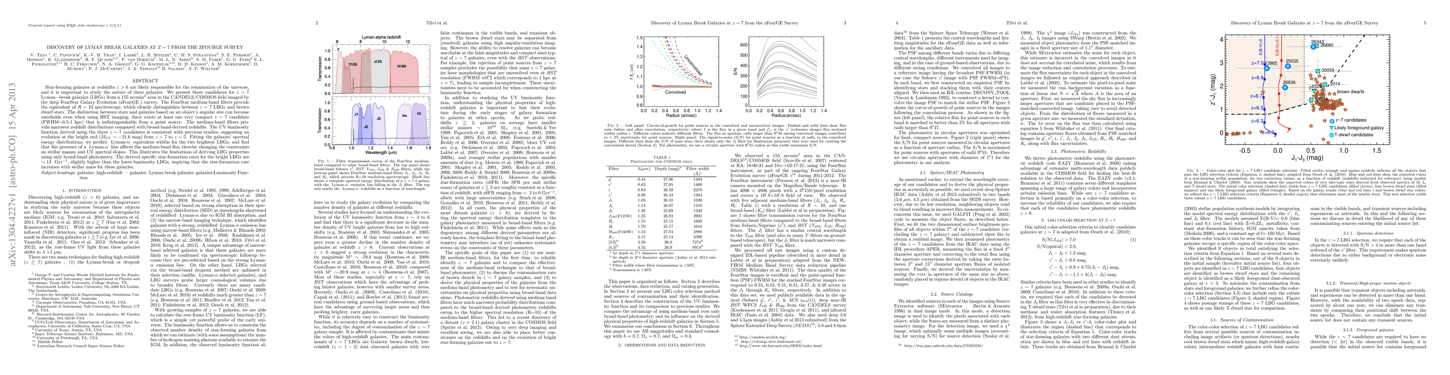 The ZFOURGE Survey identifies three z~7 Lyman-break galaxy candidates in the CANDELS/COSMOS field, distinguishing them from stars using medium-band filters. The study highlights the limitations of broad-band photometry in deriving galaxy properties and finds an evolution in UV luminosity function from z~7 to z~5.