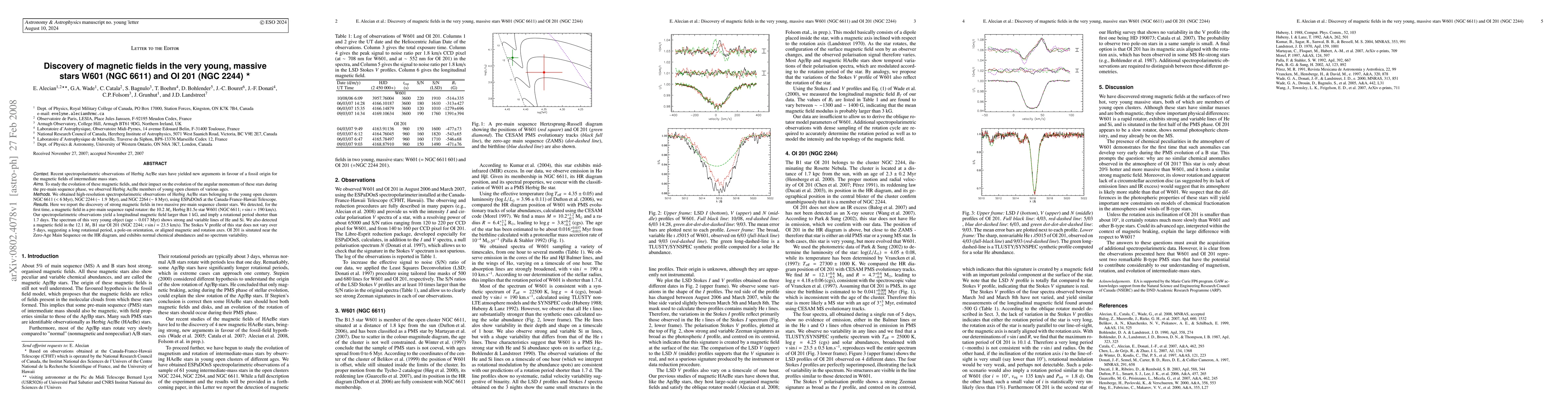 This study reports the first detection of magnetic fields in two massive pre-main sequence stars, W601 in NGC 6611 and OI 201 in NGC 2244, using high-resolution spectropolarimetry. The findings suggest these magnetic fields may have a fossil origin and influence the angular momentum evolution of these stars.