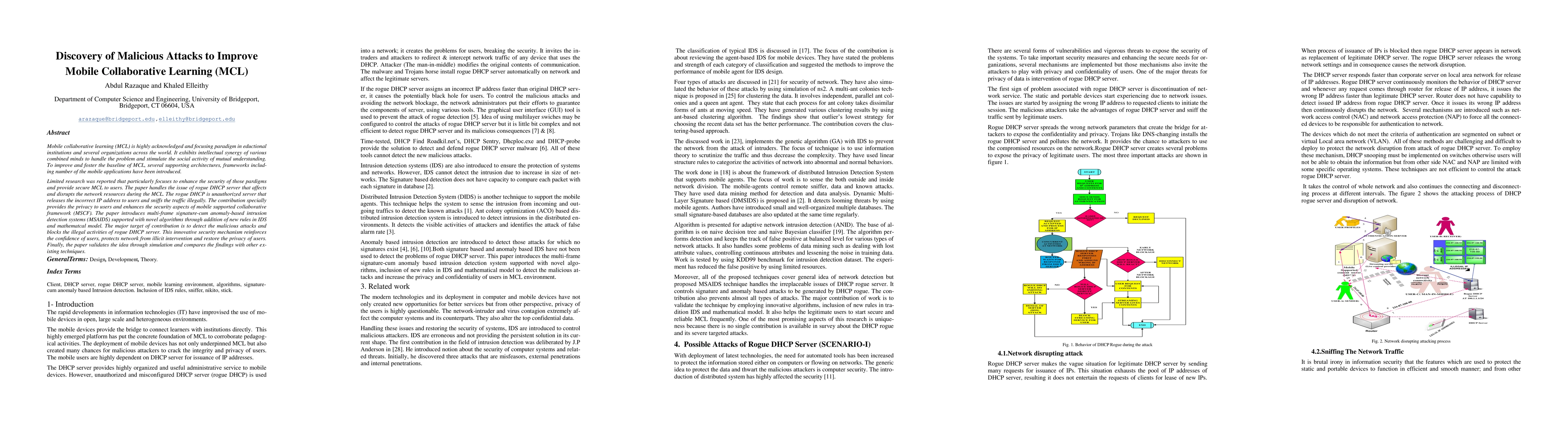 This paper proposes a novel multi-frame signature-cum anomaly-based intrusion detection system (MSAIDS) to detect and mitigate rogue DHCP server attacks in mobile collaborative learning (MCL) environments, enhancing security and user privacy. The method is validated through simulation and compared with existing techniques.