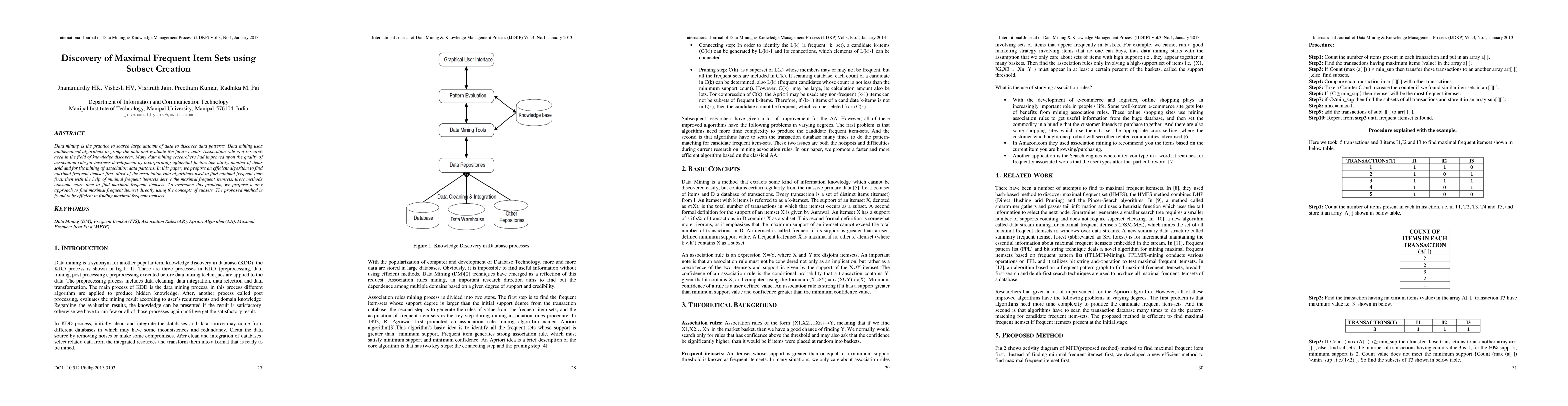 This paper proposes an efficient algorithm to directly discover maximal frequent item sets using subset creation, aiming to improve the speed of finding maximal frequent itemsets compared to traditional methods that first find minimal frequent itemsets. The new approach is shown to be efficient in mining association data patterns.