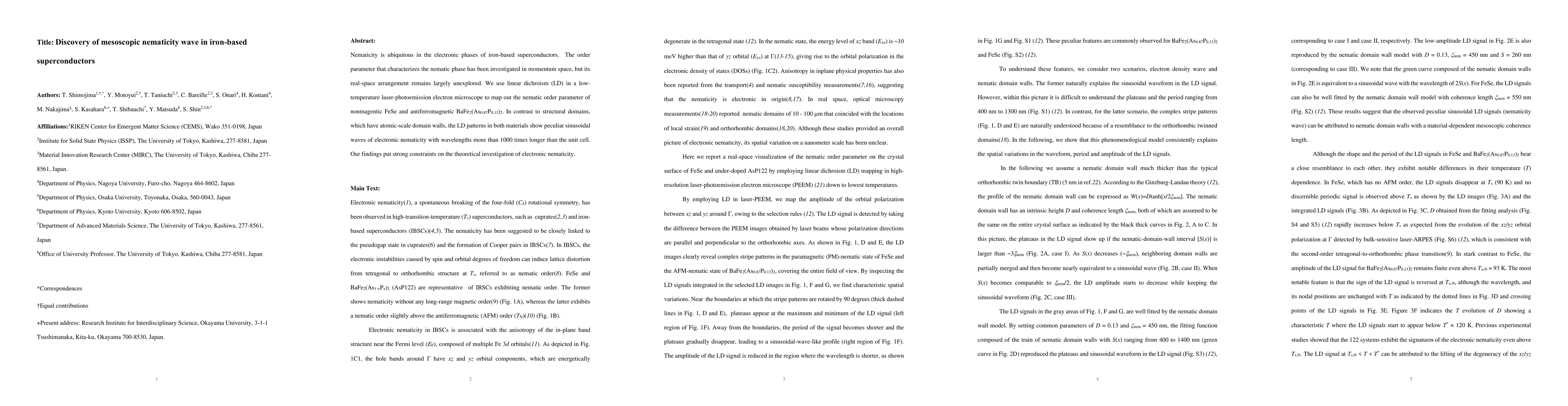 This paper reveals the discovery of mesoscopic nematicity waves in iron-based superconductors using linear dichroism in laser-photoemission microscopy. The study shows that nematic order in FeSe and BaFe2(As0.87P0.13)2 exhibits sinusoidal wave patterns with a coherence length over 1000 times longer than the unit cell, providing new insights into the quantum liquid crystalline states of correlated electrons.