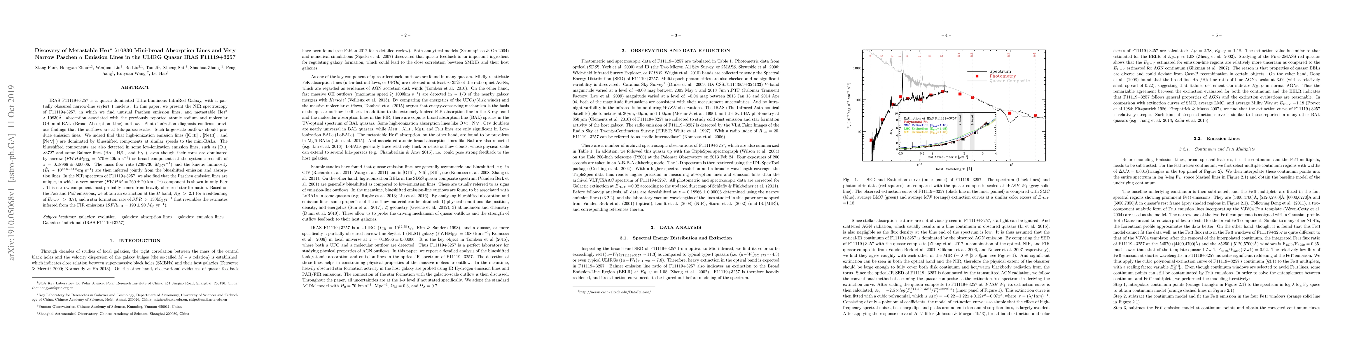 This research paper discovers unique Paschen emission lines in a quasar-dominated galaxy, indicating heavily obscured star formation, and finds metastable He I* absorption lines associated with large-scale outflows.