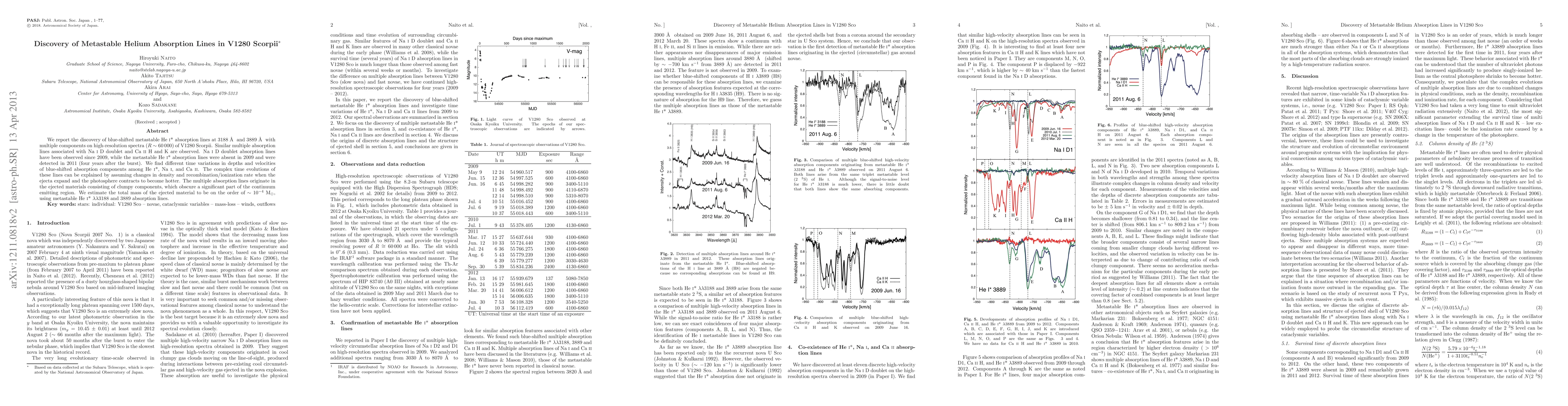 We report the discovery of blue-shifted metastable He I* absorption lines at 3188 A and 3889 A with multiple components on high-resolution spectra (R ~ 60,000) of V1280 Scorpii. Similar multiple absorption lines associated with Na I D doublet and Ca II H and K are observed. Na I D doublet absorption lines have been observed since 2009, while the metastable He I* absorption lines were absent in 2009 and were detected in 2011 (four years after the burst). We find different time variations in depths and velocities of blue-shifted absorption components among He I*, Na I, and Ca II. The complex time evolutions of these lines can be explained by assuming changes in density and recombination/ionization rate when the ejecta expand and the photosphere contracts to become hotter. The multiple absorption lines originate in the ejected materials consisting of clumpy components, which obscure a significant part of the continuum emitting region. We estimate the total mass of the ejected material to be on the order of ~ 10^{-4} Mo, using metastable He I* 3188 and 3889 absorption lines.
