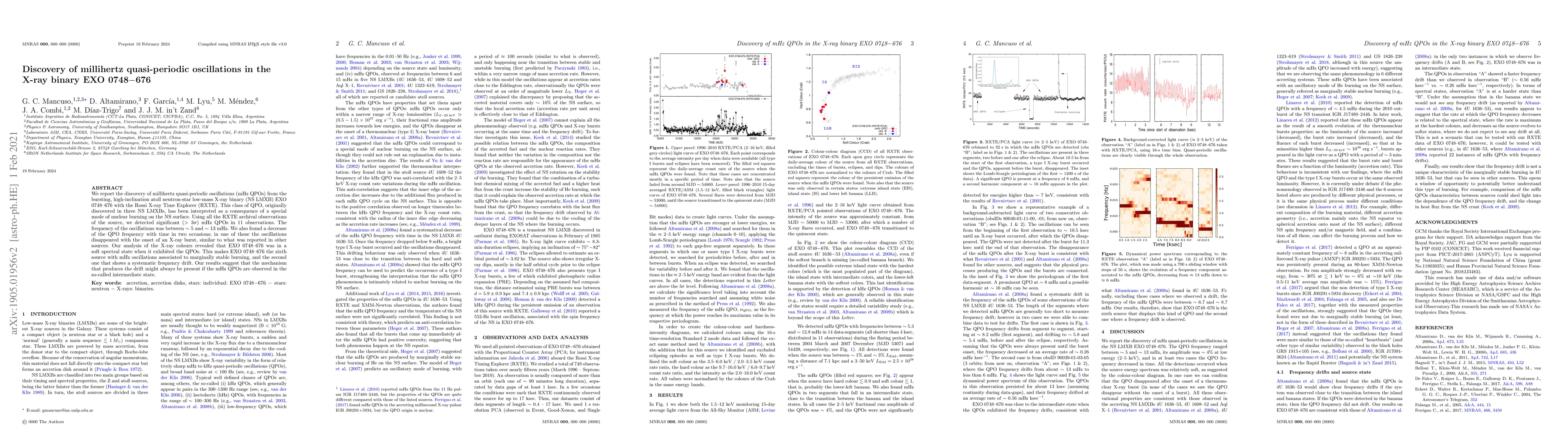 The paper reports the discovery of millihertz quasi-periodic oscillations (mHz QPOs) in the neutron-star low-mass X-ray binary EXO 0748--676 using RXTE data, marking the sixth source with such oscillations linked to marginally stable burning. The detected QPOs exhibited a frequency drift and were observed in the soft spectral state.