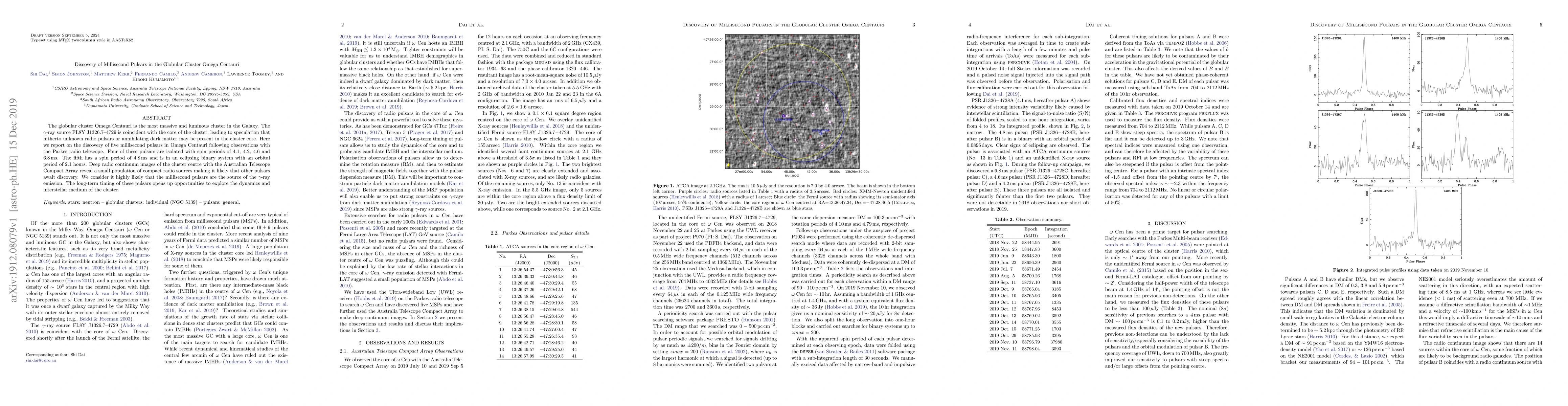 The discovery of five millisecond pulsars in the globular cluster Omega Centauri, including four isolated pulsars and one in an eclipsing binary, suggests these pulsars are likely the source of the observed $\gamma$-ray emission, offering new insights into the cluster's dynamics and interstellar medium.