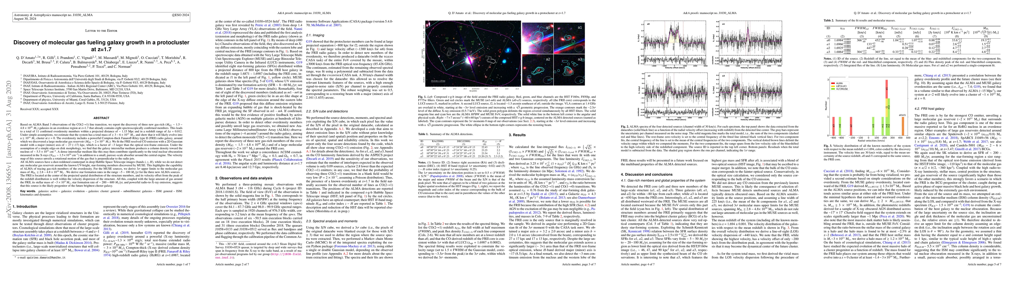 The study reveals three gas-rich galaxies in a protocluster at z=1.7, identified via ALMA observations, contributing to a total of 11 members. This system, with a projected mass of >= 3-6 x 10^13 M_sun, is expected to evolve into a >~ 10^14 M_sun cluster. A powerful FRII radio-galaxy at the cluster center hosts a massive molecular gas reservoir, suggesting it may become the future brightest cluster galaxy.
