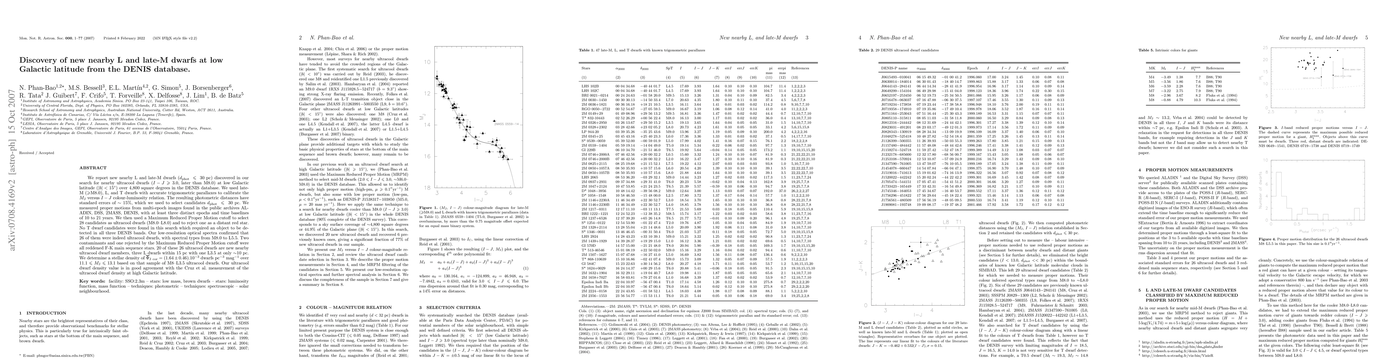 This paper reports the discovery of new nearby L and late-M dwarfs (within 30 pc) at low Galactic latitude using the DENIS database. The authors calibrated the M_J versus I-J colour-luminosity relation and identified 28 ultracool dwarf candidates, confirming 26 as true ultracool dwarfs with spectral types from M8.0 to L5.5, including 20 new nearby members.