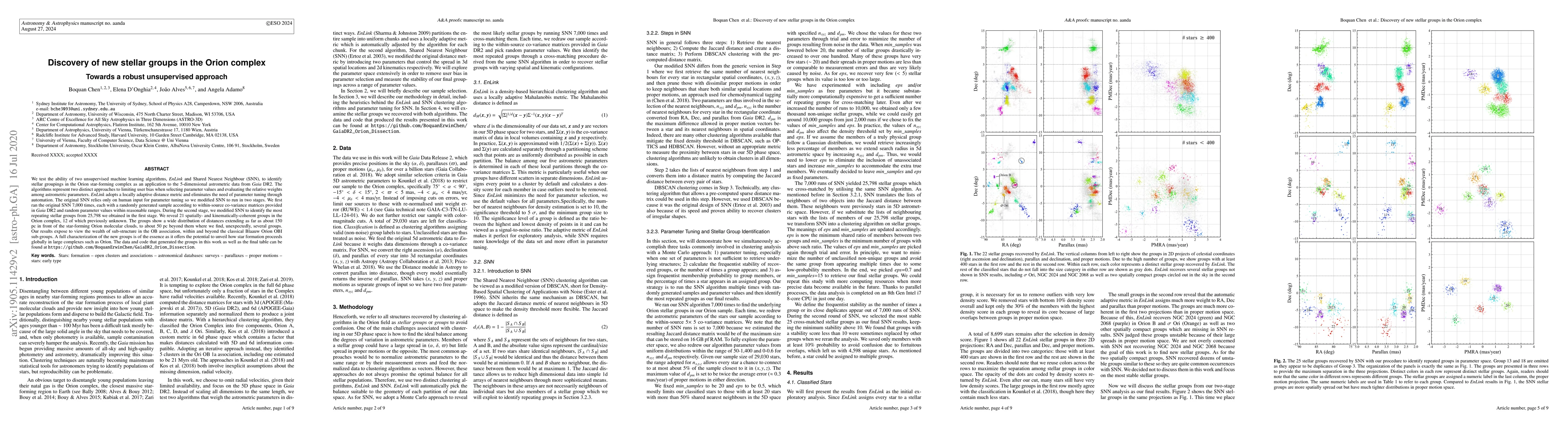 We test the ability of two unsupervised machine learning algorithms, \textit{EnLink} and Shared Nearest Neighbour (SNN), to identify stellar groupings in the Orion star-forming complex as an application to the 5-dimensional astrometric data from \textit{Gaia} DR2. The algorithms represent two distinct approaches to limiting user bias when selecting parameter values and evaluating the relative weights among astrometric parameters. \textit{EnLink} adopts a locally adaptive distance metric and eliminates the need of parameter tuning through automation. The original SNN relies only on human input for parameter tuning so we modified SNN to run in two stages. We first ran the original SNN 7,000 times, each with a randomly generated sample according to within-source co-variance matrices provided in \textit{Gaia} DR2 and random parameter values within reasonable ranges. During the second stage, we modified SNN to identify the most repeating stellar groups from 25,798 we obtained in the first stage. We reveal 21 spatially- and kinematically-coherent groups in the Orion complex, 12 of which previously unknown. The groups show a wide distribution of distances extending as far as about 150 pc in front of the star-forming Orion molecular clouds, to about 50 pc beyond them where we find, unexpectedly, several groups. Our results expose to view the wealth of sub-structure in the OB association, within and beyond the classical Blaauw Orion OBI sub-groups. A full characterization of the new groups is of the essence as it offers the potential to unveil how star formation proceeds globally in large complexes such as Orion. The data and code that generated the groups in this work as well as the final table can be found at \protect\url{ https://github.com/BoquanErwinChen/GaiaDR2_Orion_Dissection}.