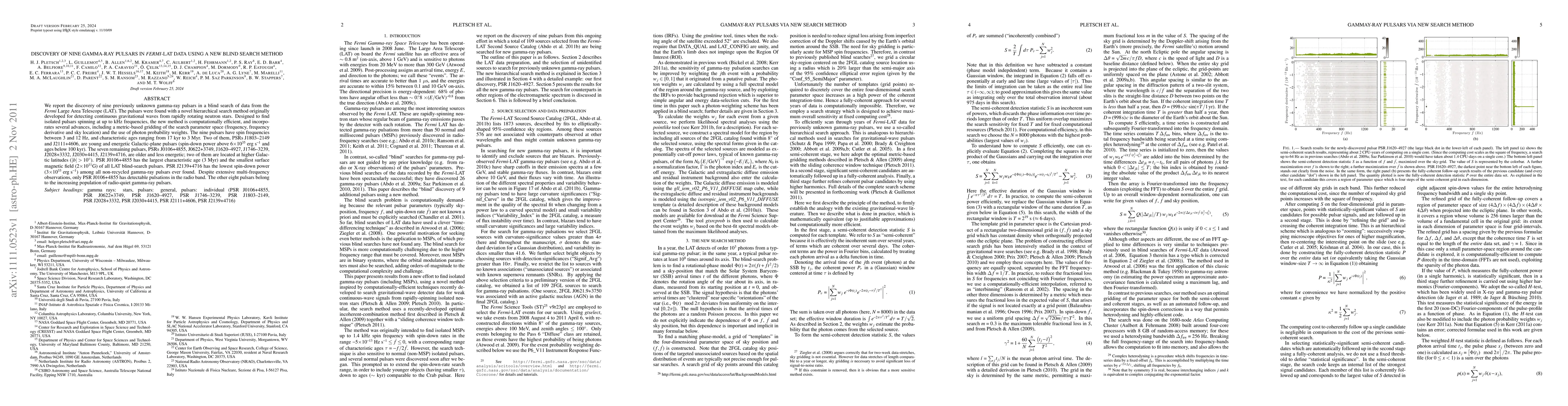 Researchers discovered nine new gamma-ray pulsars in Fermi-LAT data using a novel blind search method, revealing spin frequencies between 3-12 Hz and characteristic ages from 17 kyr to 3 Myr.