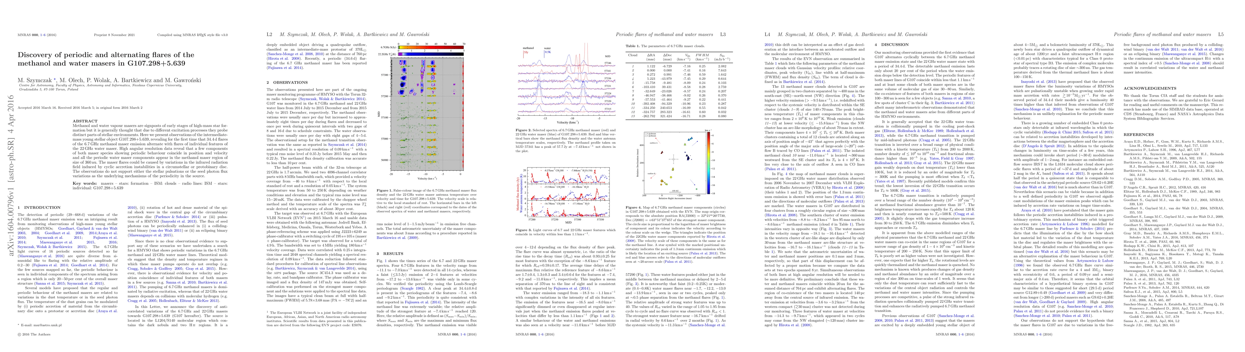 Methanol and water vapour masers are signposts of early stages of high-mass star formation but it is generally thought that due to different excitation processes they probe distinct parts of stellar environments. Here we present observations of the intermediate-mass young stellar object G107.298+5.639, revealing for the first time that 34.4 d flares of the 6.7 GHz methanol maser emission alternate with flares of individual features of the 22 GHz water maser. High angular resolution data reveal that a few components of both maser species showing periodic behaviour coincide in position and velocity and all the periodic water maser components appear in the methanol maser region of size of 360 au. The maser flares could be caused by variations in the infrared radiation field induced by cyclic accretion instabilities in a circumstellar or protobinary disc. The observations do not support either the stellar pulsations or the seed photon flux variations as the underlying mechanisms of the periodicity in the source.