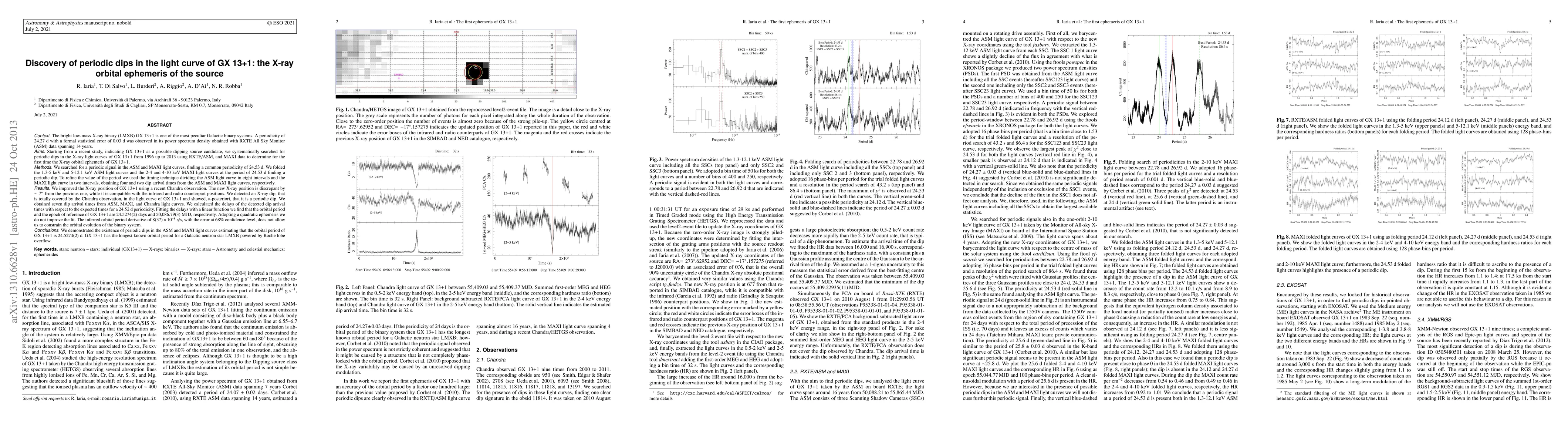 The research paper reports the discovery of periodic dips in the X-ray light curve of the low-mass X-ray binary GX 13+1, revealing a 24.53-day periodicity in its light curves. The study determined the X-ray orbital ephemeris, confirming the orbital period as 24.5274(2) days and the epoch of reference as 50,086.79(3) MJD.